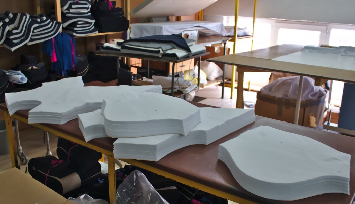 На фабрике ткань раскатывают на раскройном столе и оставляют разглаживаться на несколько часов. Затем закройщицы закрепляют на ткани лекала и с помощью специального ножа вырезают детали изделия.