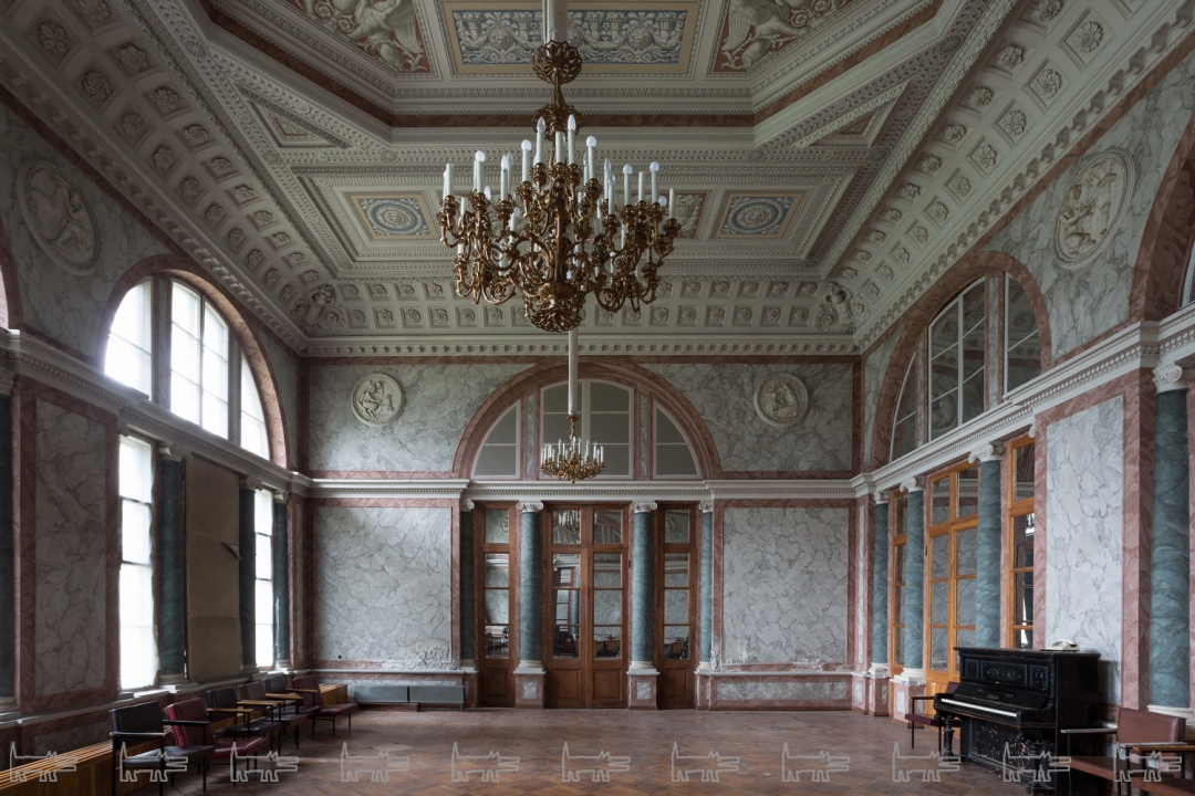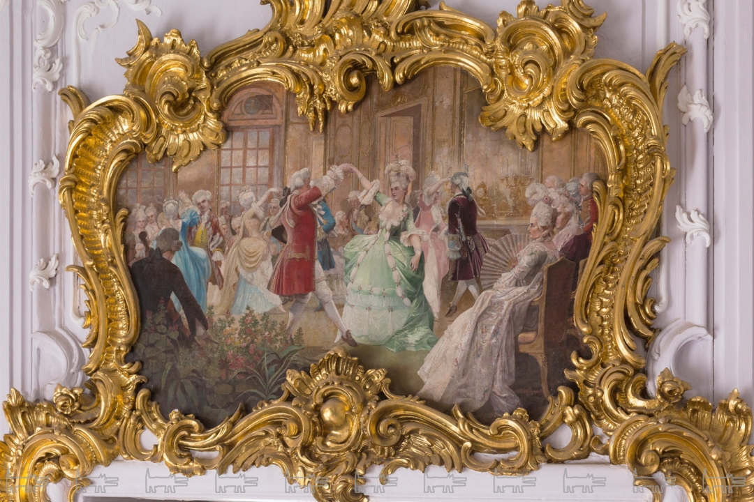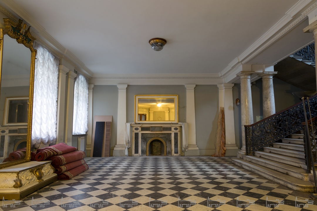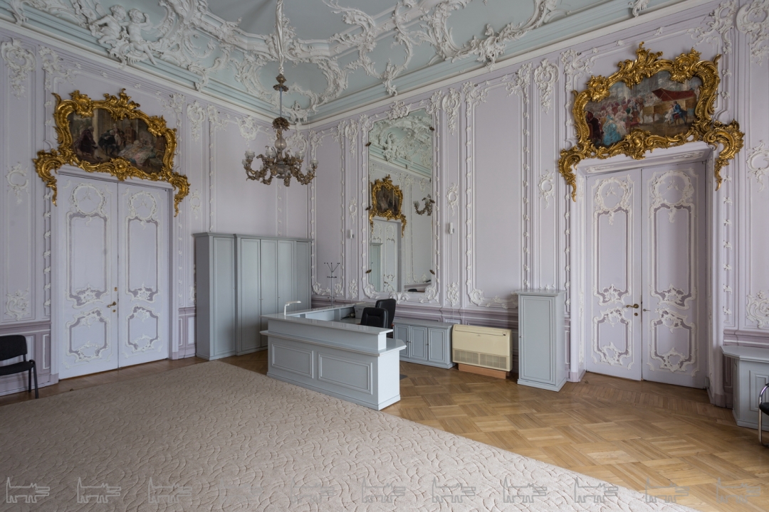 В парадных помещениях — отделка в стилях рококо и классицизм. Здесь есть скульптурные горельефы, гризайльные росписи, декоративная живопись, бронзовые светильники и мраморные камины.