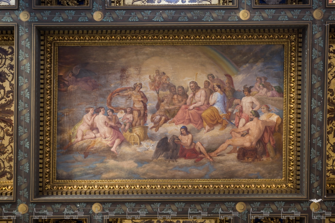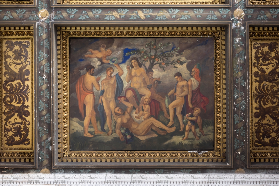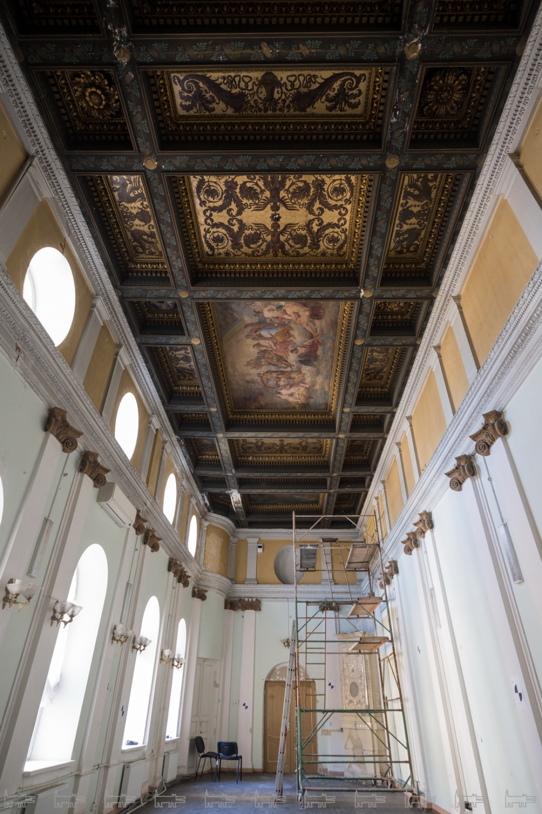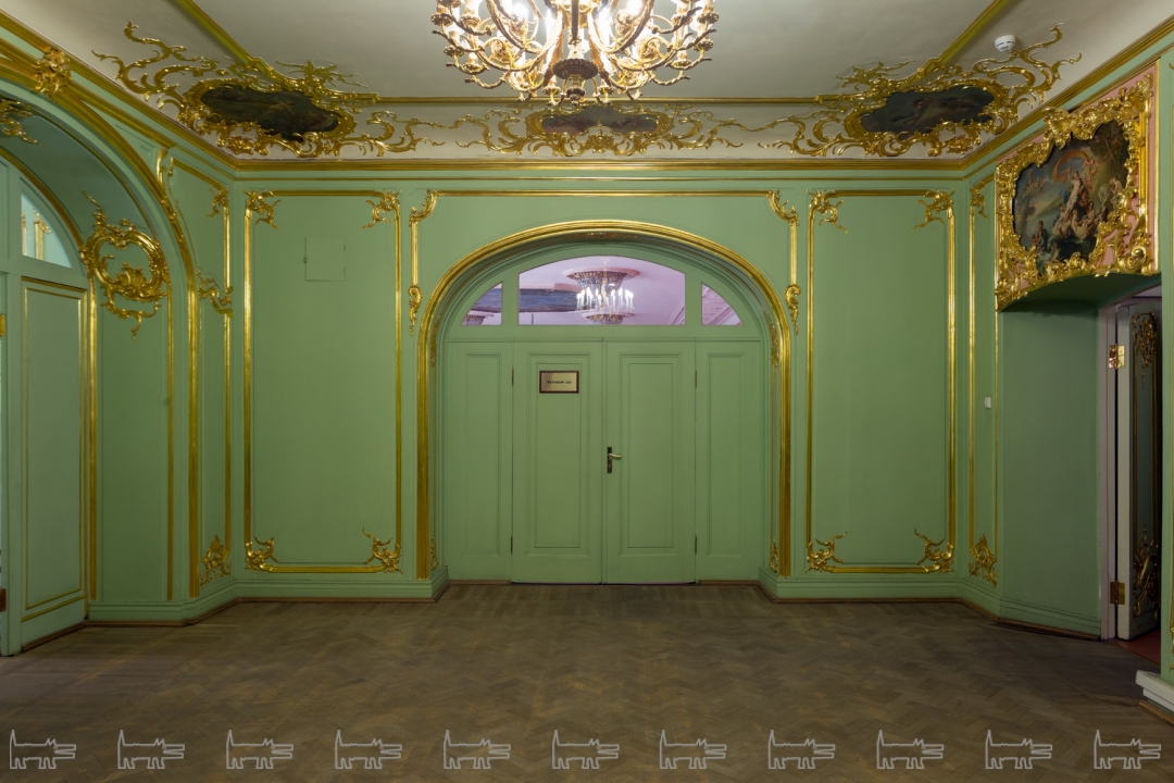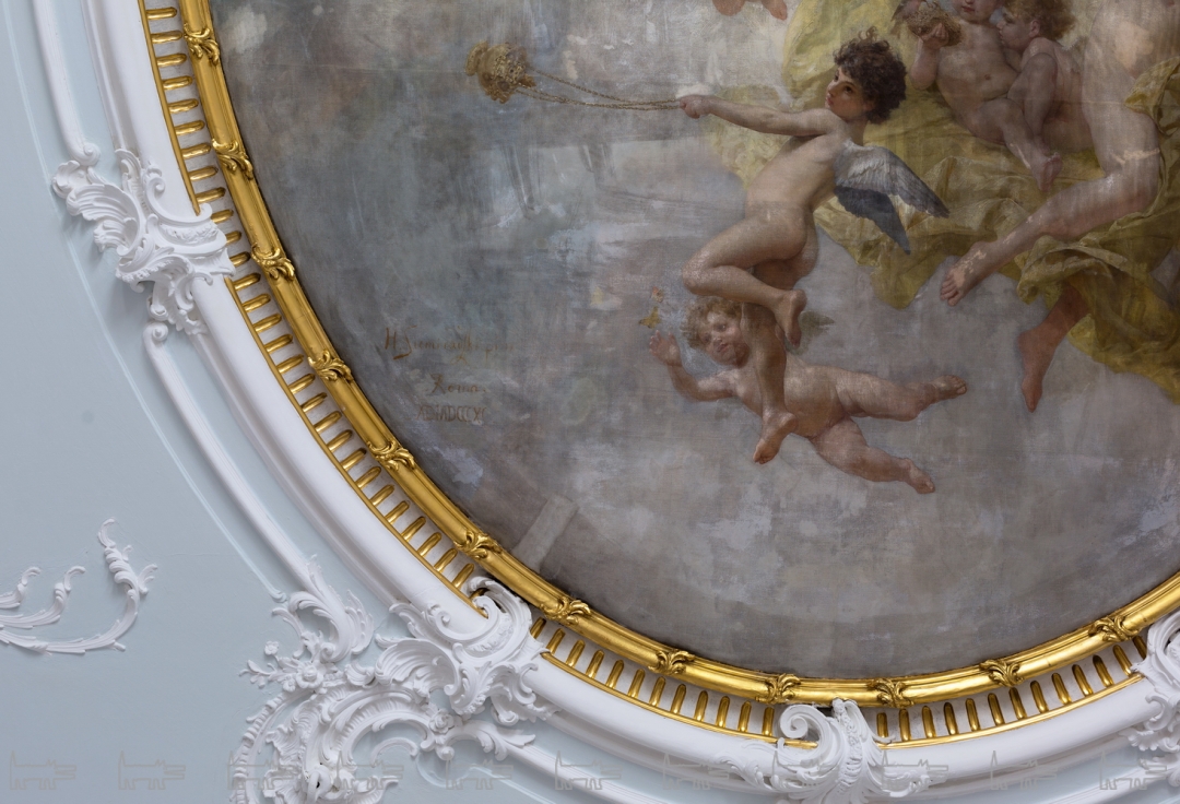 В 1880-х годах последний владелец здания Ю. С. Нечаев-Мальцов заказал зодчему Леонтию Бенуа обновление двух больших парадных залов второго этажа. Архитектор добавил сюда новые камины, паркет, зеркала в бронзовых переплетах и живопись. Для украшения потолков были специально заказаны два живописных плафона на аллегорическую тему у Генриха Семирадского – «Весна» и «Аврора» были написаны им в римской мастерской и доставлены в Петербург в 1890-м году. В этот же период были созданы и три десюдепорта на тему «Галантной эпохи» для Голубой гостиной, выполненные придворным художником Адольфом Шарлеманем.