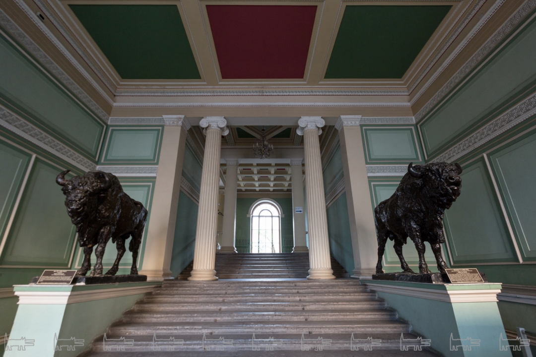 В просторном вестибюле у широкой белокаменной лестницы в начале XX в. были установлены статуи двух зубров в натуральную величину скульпторов Г. Р. Зелемана и Р. Р. Баха. Сцена у входа именно в этот дом легла в основу стихотворения Николая Некрасова «Размышления у парадного подъезда».