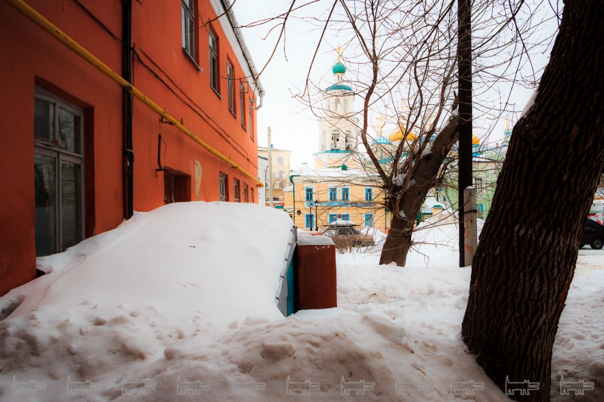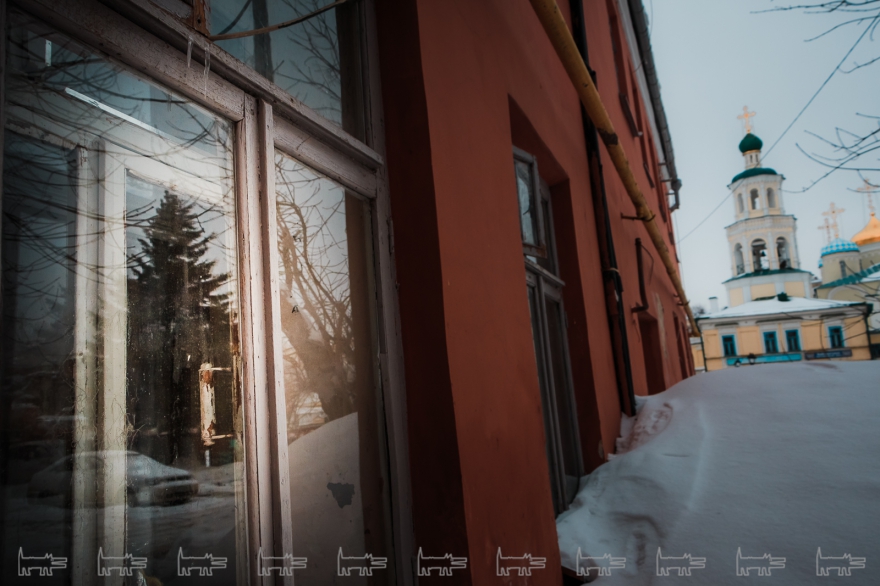 Когда солнце восходит, то очень красиво освещает купола. Во второй половине дня красота просто безумная. В семидесятые перед нами еще стоял другой дом, двухэтажный. В соседнем жил на первом этаже художник Ильгизар Хасанов, который открыл «Смену». Пристрой слева появился в советское время. Он был трехэтажным, последний этаж сгорел. Сейчас там живут работники ЖЭУ, по договору. К сносу его не подписали. Я считаю, что он нелепо выглядит, возможно, из-за него наш дом воспринимают, как нечто несуразное. А ведь он клевый. Весной мы сажаем во дворе цветочки, делаем газончик.