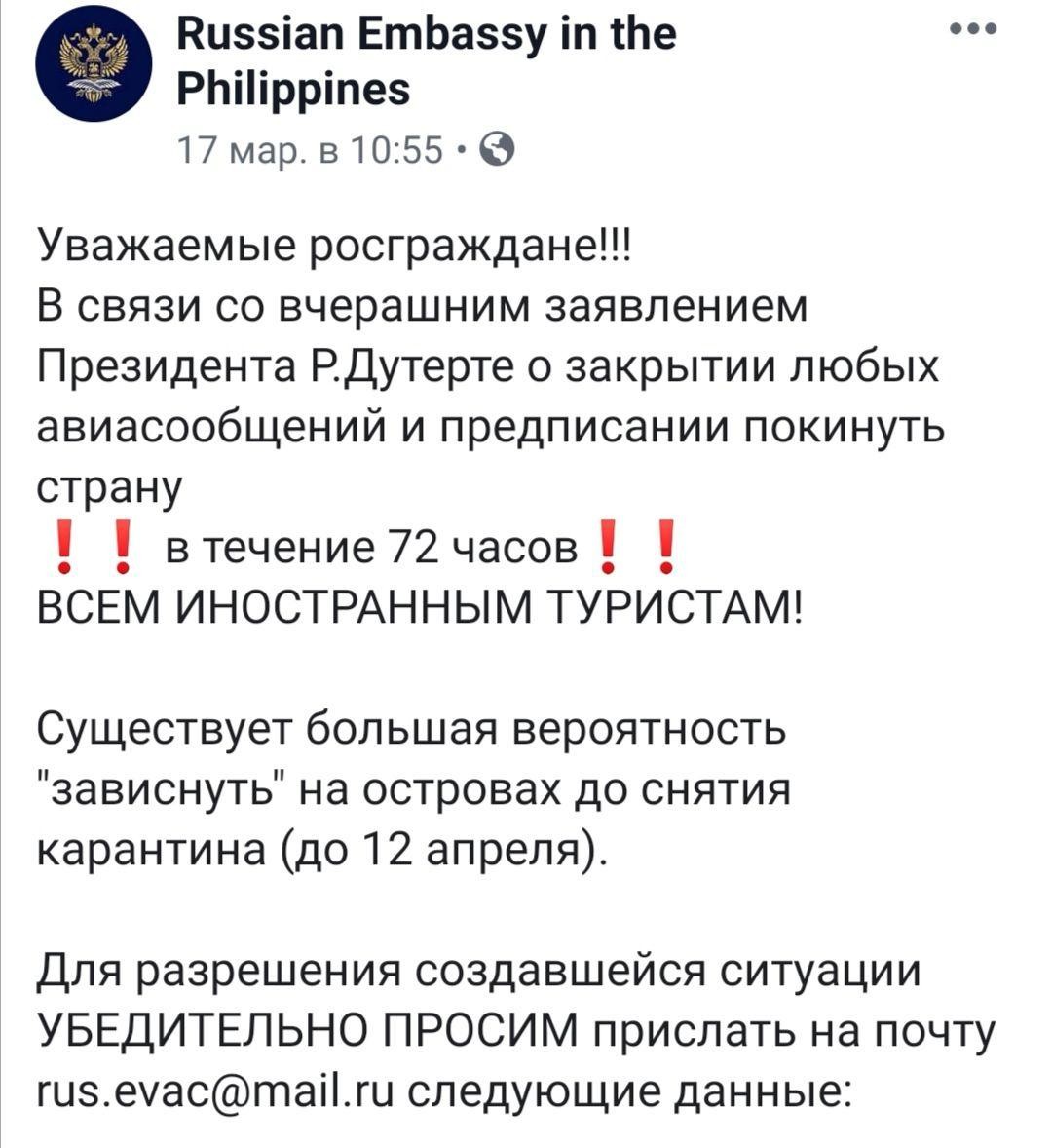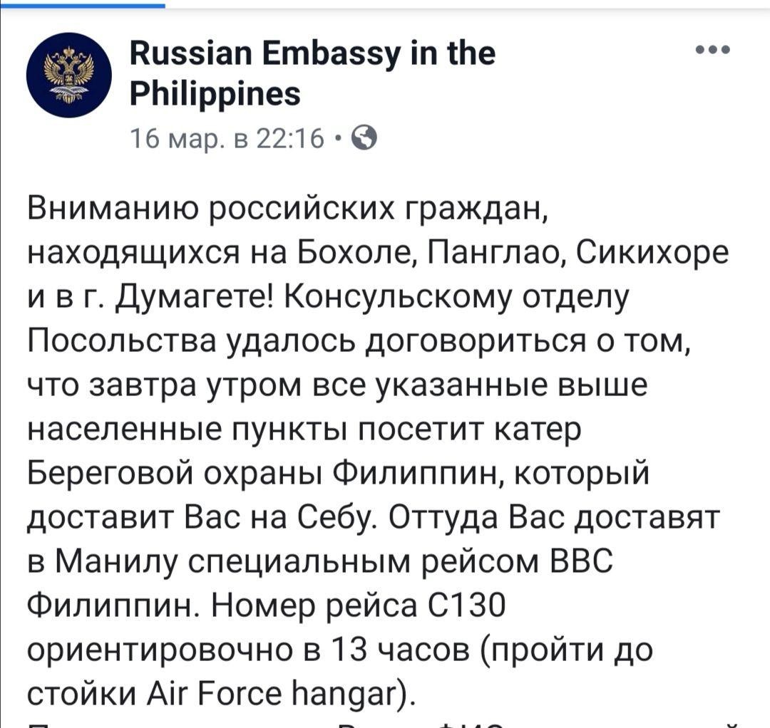 Как только мы решили, что выбора нет — остаемся на Филиппинах и будем ждать конца мирового апокалипсиса на пляже, как посольство заявило, что за россиянами пришлют спецборт и доставят нас в Москву. План такой: за два дня нас предупредят о вылете, затем катер проедется по островам и соберет всех 400 туристов в одном месте, и мы полетим толпой на родину. Остаться можно, но под свою ответственность — посольство помогать больше не будет.
