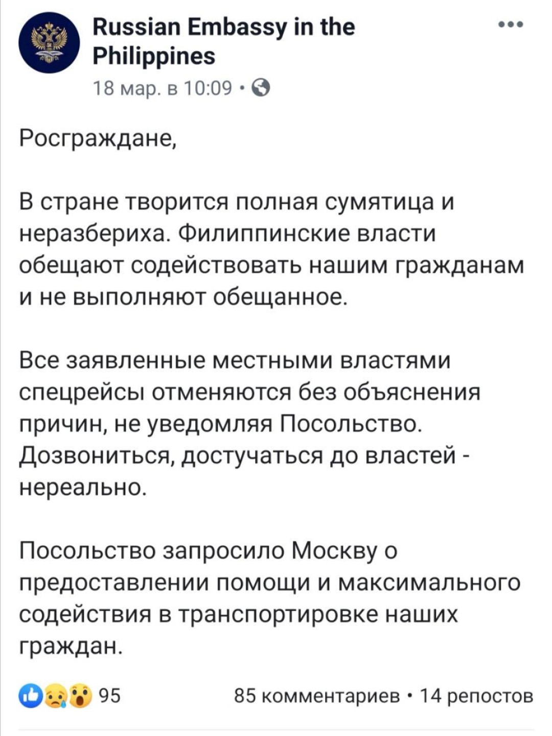 Возмущенных людей тоже можно понять — им пришлось снимать гостиницы и ждать спецрейс, который так и не прилетел. Насколько мы знаем, часть из них смогли самостоятельно сесть на самолет до Манилы и вылететь в Москву (некоторым пришлось покупать билеты по три раза, потому что рейсы постоянно отменяли). Остальные остались ждать спецборт. Говорят, почетный консул купил застрявшим гражданам еду и воду на свои деньги. Друзья из Австрии рассказали, что их граждане точно так же ждут в аэропорту и не знают, что делать дальше.