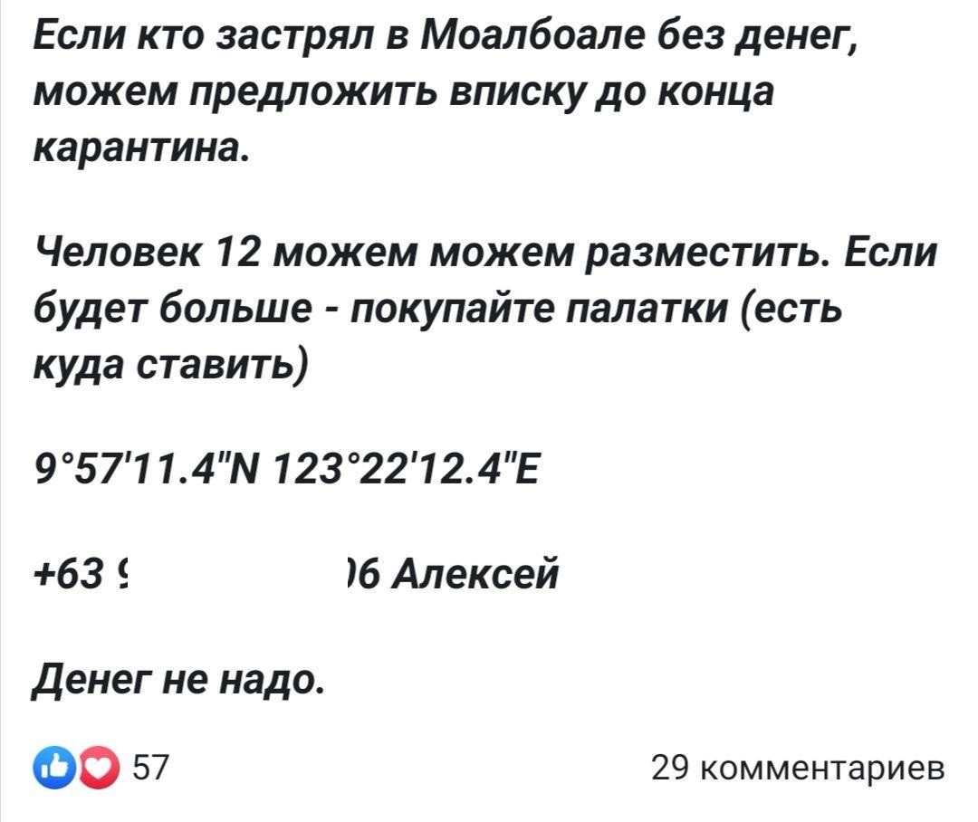 Радует, что русские друг другу помогают — например, на острове Себу владельцы хостела предложили всем застрявшим бесплатную койку, чай, кофе и Wi-Fi. В телеграм-чатах бешеная активность, минимум 300 человек постоянно обсуждают новости и делятся советами: например, в каком банкомате лучше снимать деньги.