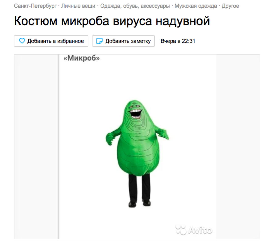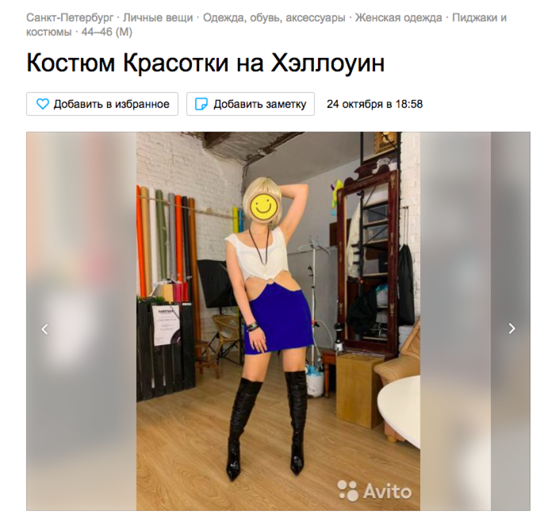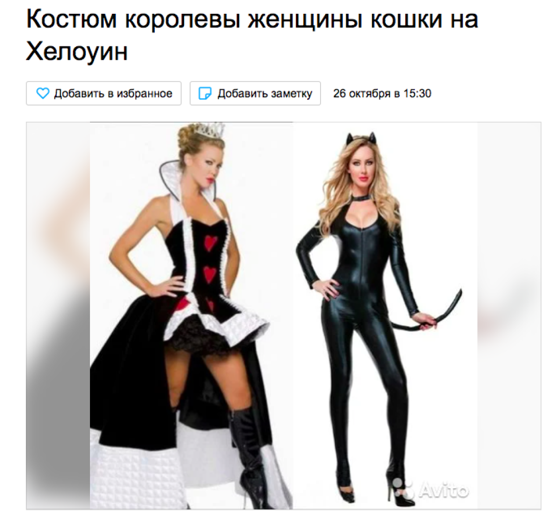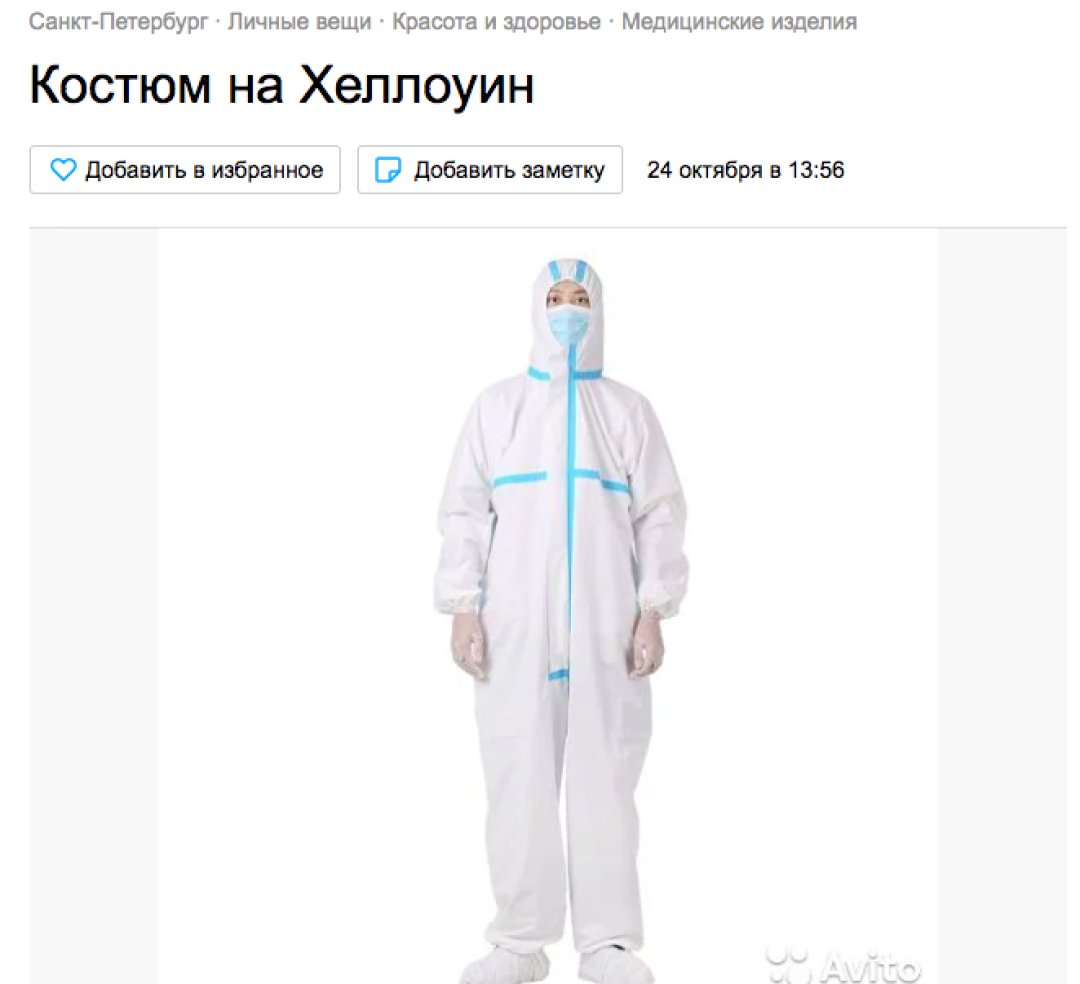 Чтобы оценить, как американский тренд лег на русскую почву можно открыть сайт Avito: одним из первых нам выпало объявление о продаже платья-сетки из страз (надевается поверх нижнего белья) с пометкой «Отлично на Хеллоуин 🎃». Медсестра, женщина-полицейский в мини-юбке с наручниками, учительница в чулках — как будто неликвид секс-шопа пытаются сбыть под более актуальным тэгом. В этом году русский хеллоуин, бессмысленный и беспощадный, получил характерную ковид-интонацию: в недрах Avito появились костюмы чумного доктора, костюм микроба и даже костюм врача, работающего в красной зоне. Жаль, что костюм санитайзера, как у Кэти Пэрри, найти нам не удалось.