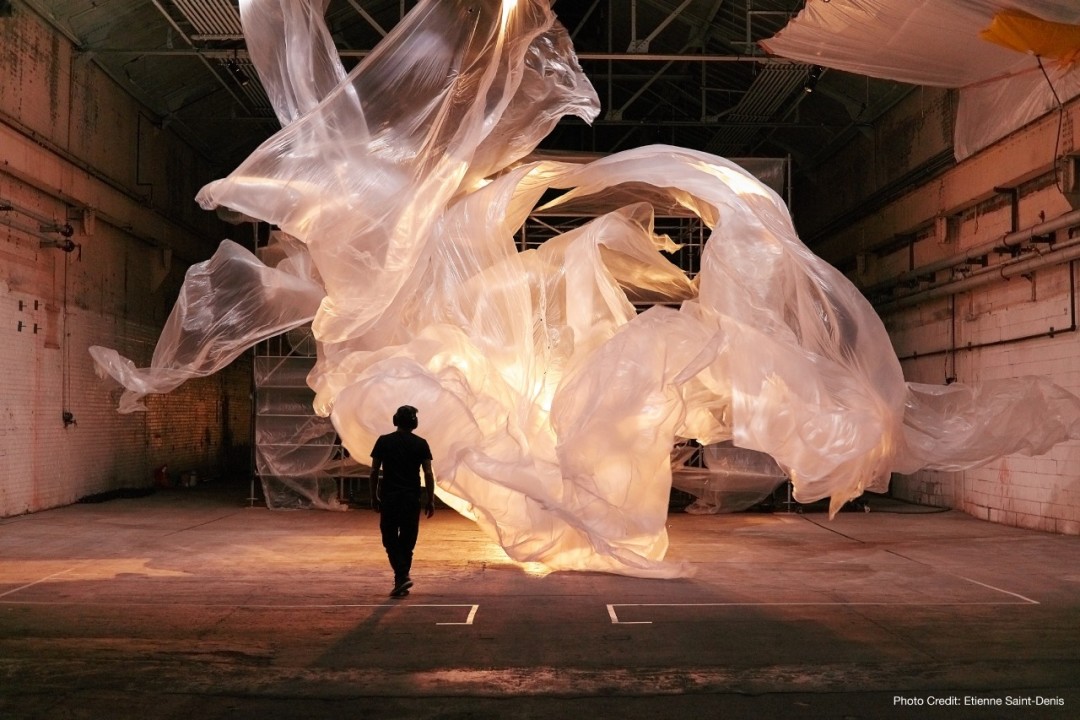 «Whispers» («Шепоты») — их второй совместный проект (первым был «Altered States Of Light Vol1» в 2016-м), соединяющий иммерсивный перфоманс и собственно инсталляцию. Конкретно — это огромные, свободно колыхающиеся, словно от порыва бриза, пластиковые полотна, создающие эффект присутствия на морском побережье, но, увы, загрязненном неперерабатываемым мусором.