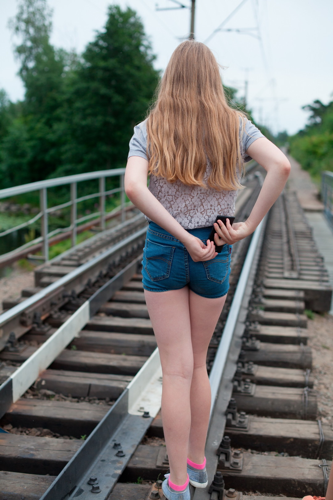 С этих фотографий, пожалуй, началась моя серия о постсоветском поколении. Я поехал в Приозерск в выходной день и нашел там интересное место — железная дорога идёт над озером. Вокруг нее тусовалось много ребят, кто-то прыгал в воду с моста. Я заметил, что две девушки медленно идут вдоль железной дороги прямо по путям и предложил одной из них сфотографироваться. Так получилась фотография, где она смотрит в кадр. Затем они пошли дальше, и я зафиксировал момент, когда она убирала телефон в задний карман. Получилась одна из ключевых фотографий в этой серии, хотя я не сразу обратил на неё внимание.