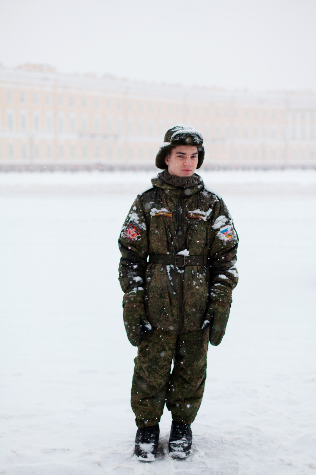 Я сделал этот кадр в в январе, в один из самых снежных дней в этом году. Я шел на выставку «Христос в темнице» в Манеже и проходил мимо Дворцовой площади. Там была репетиция военного парада ко Дню снятия блокады, поэтому все было оцеплено по периметру солдатами. Их одежда была почти полностью засыпана снегом, но форма все равно выделялась на белом фоне. Это было похоже на сцену из «Матрицы». Я сделал несколько снимков, но понравился мне только один кадр — где парень практически не реагировал на мою камеру.