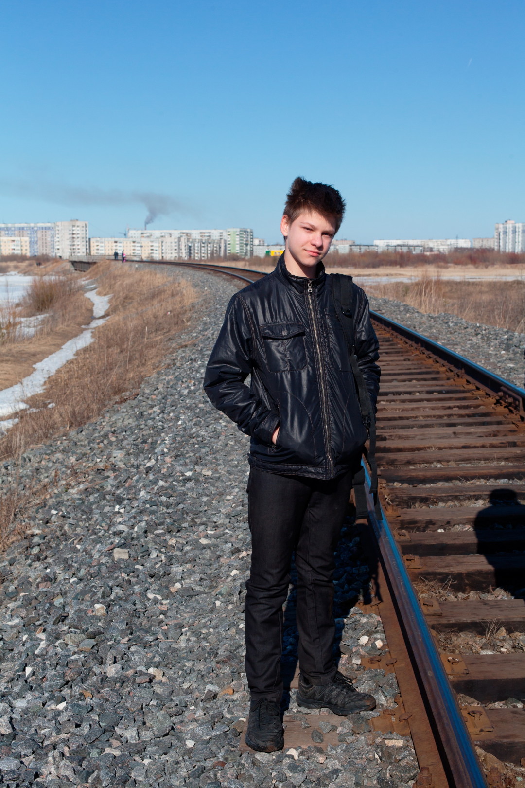 Когда я был в Архангельске, то на один день поехал в Северодвинск. Это очень странное место, похожее немного на насыпь на Васильевском острове: с одной стороны Белое море, с другой — панельные многоэтажки. Между ними огромное пространство, заросшее кустами и травой, из-за которого моря почти не видно, и в то же время это — променад: по зарослям идет заброшенная железная дорога, и вдоль неё гуляют местные жители. Парень на фотографии был одет во всё черное, но выражение лица у него было задумчиво-отрешённое. Уже позже я заметил, что в кадр попал черный дым где-то сзади.
