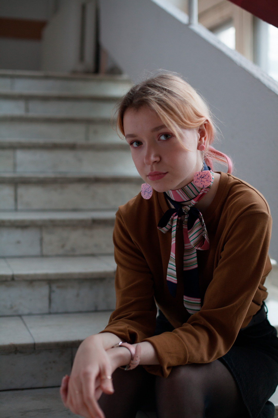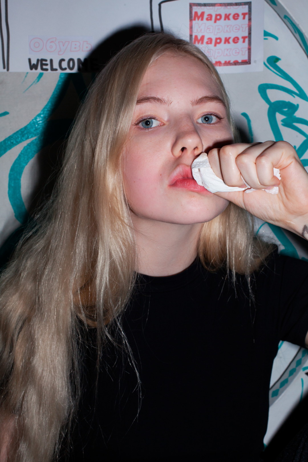Лестница, где сидит девочка, находится в ДК Газа — важное место для этой серии, там я сделал несколько картинок. Как-то я пришел в ДК на маркет — мои друзья участвовали и делали татуировки. На мероприятии было довольно скучно, и я стал фотографировать людей, которые меня чем-то визуально зацепили. Девушку на фото зовут Ника. Меня привлекло, я думаю, сочетание деталей её одежды с интерьерами ДК Газа. Позже я узнал, что у Ники и ее друзей есть своё самоорганизованное творческое объединение «Сякий стиль», почти все они фотографы. Через какое-то время она позвала меня на их выставку под названием «Мутный глаз». Там я сделал ещё одну фотографию — незнакомая девушка просто вытирала помаду, я не просил ее позировать.