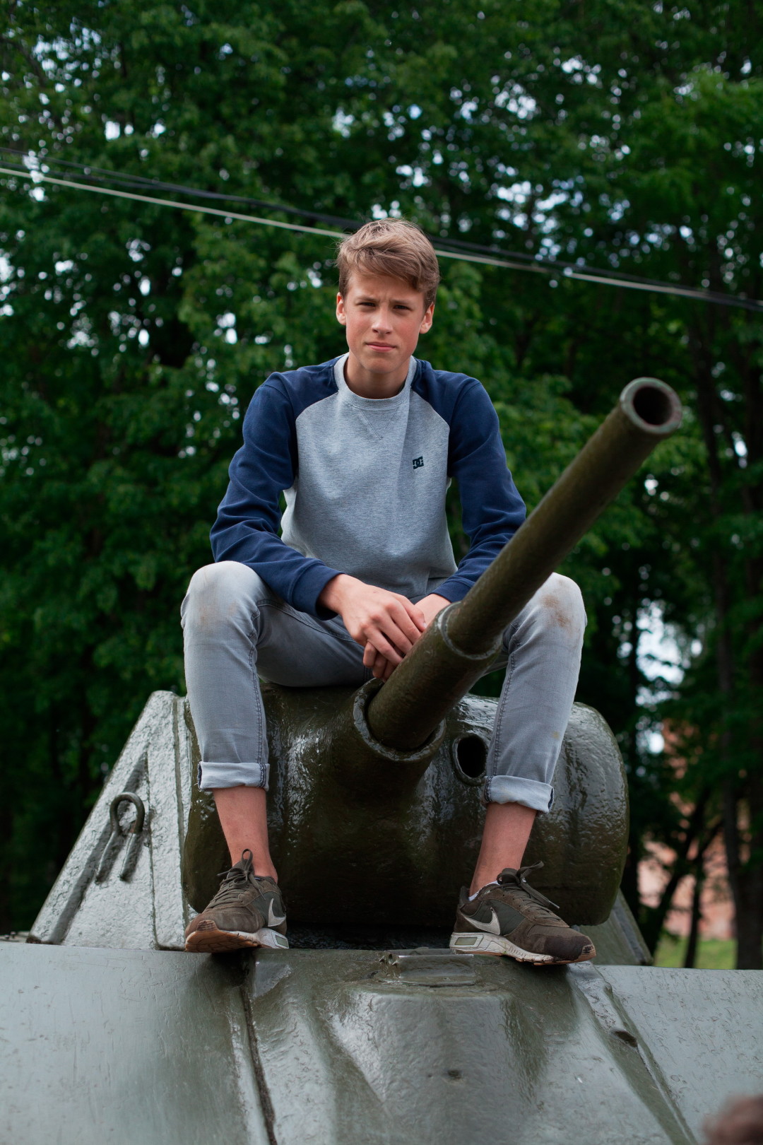 Этот танк стоит в Новгороде возле Кремля, со стороны реки. Из-за размера он кажется игрушечным. Когда я шел мимо, несколько подростков сидели на нем, причем один прямо на пушке. Они были одеты очень модно и, очевидно, не имели ничего общего с идеологией прошлого, а их облик контрастировал с устаревшей техникой времен войны.