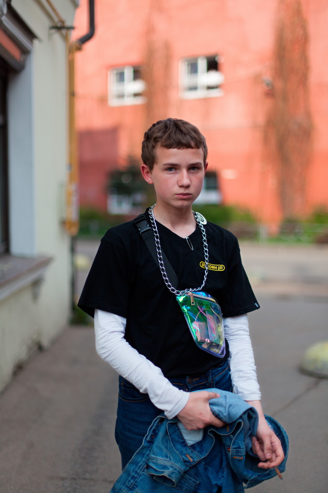 Однажды я случайно наткнулся на инстаграм минского парня по имени Максим, и мы познакомились в интернете. Мне понравилось, что он активно пробует себя в роли модели для съёмок и к тому же сам занимается фотографией. Я хотел сфотографировать его в Минске, но нам не удалось состыковаться. Повезло, что через какое-то время он оказался ненадолго в Петербурге. Я знал, что Максим увлекается архитектурой советского модернизма, поэтому выбрал для съемки окрестности метро «Приморская». В итоге фотография стала обложкой книги. Ещё несколько кадров я сделал в районе «Нарвской» и Кировского завода. В этом году он поступил в университет в Вильнюсе и планирует стать дизайнером.