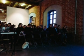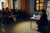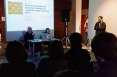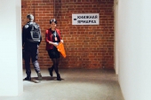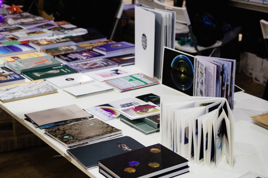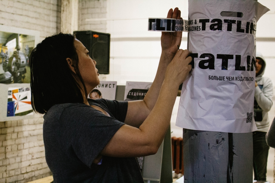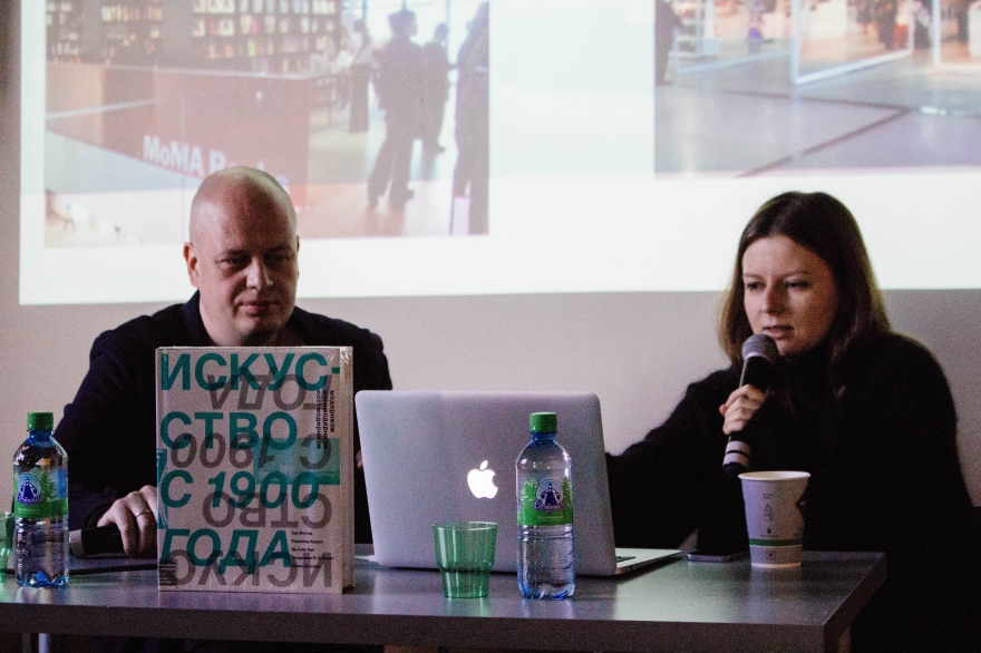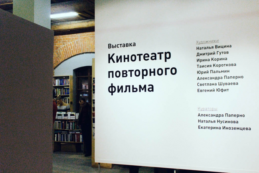Заходим в ЦСК, получаем красный браслет-проходку за 100 рублей (стоимость входа) и сразу натыкаемся на коллективную выставку «Кинотеатр повторного фильма» - для посетителей она стала своеобразным бонусом. В этом же зале расположился лекторий, где презентовали книгу «Искусство с 1900 года: модернизм, антимодернизм, постмодернизм» Екатерина Иноземцева, куратор Музея современного искусства «Гараж» и Михаил Котомин, директор и главный редактор издательства Ad Marginem. Здесь же в роли спикеров себя попробовали художник Ирина Корина и дизайнер Дмитрий Мордвинцев, а также под занавес первого дня фестиваля обсудили феномен small press в России.