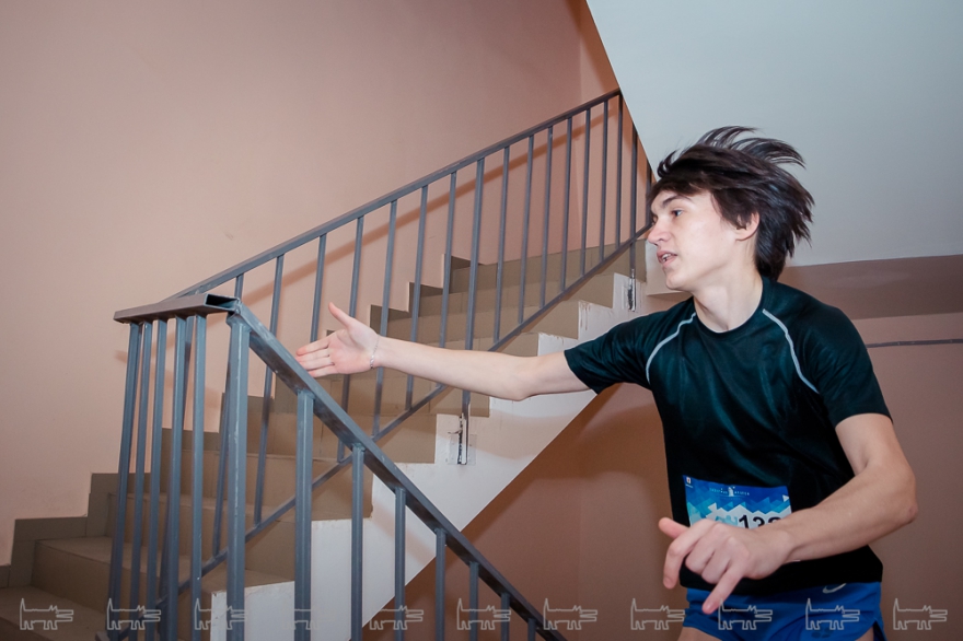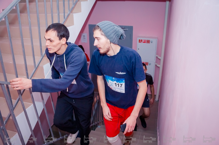 Напомним, что ранее местом вертикальных забегов служил физфак КГУ, который короче высотки на Камалеева в два раза. Посмотрев на коллег с камерами, редактор сайта налепил номер 86 и дождался своей очереди. Отсутствие регулярных тренировок, безусловно, сказывалось. Первые 10 этажей даются легко, поскольку любой из нас многократно переживал отключение лифта в обычных многоэтажках.