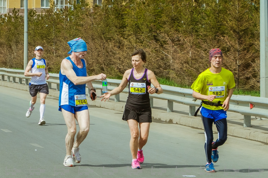 На марафоне привлекает взаимопомощь, стремление к победе, ощущение равенства и одновременно ощущение, что делить участникам совершено нечего, Те, кто шел мимо или ехал на велосипеде часто, как могли подбадривали бегущих, а были и специальные группы поддержки - на велосипедах, с дудками или плакатами. Одна активная болельщица сидела в ресторане на открытой террасе и выбегала попривествовать своих - из Екатеринбурга или Омска, каждый раз, как видела знакомый номер. Посередине трассы встретила мужчину с коляской - оказалось он сам спортсмен и сейчас бегут его друзья - из Казани и Набережных Челнов, так что он не отрываясь от присмотра за ребенком, поддерживал коллег по спорту.