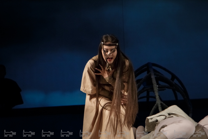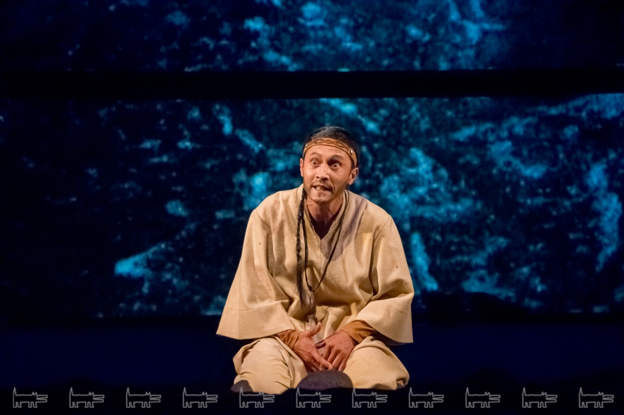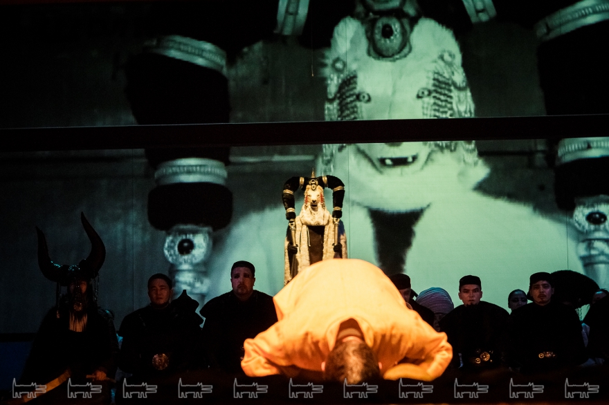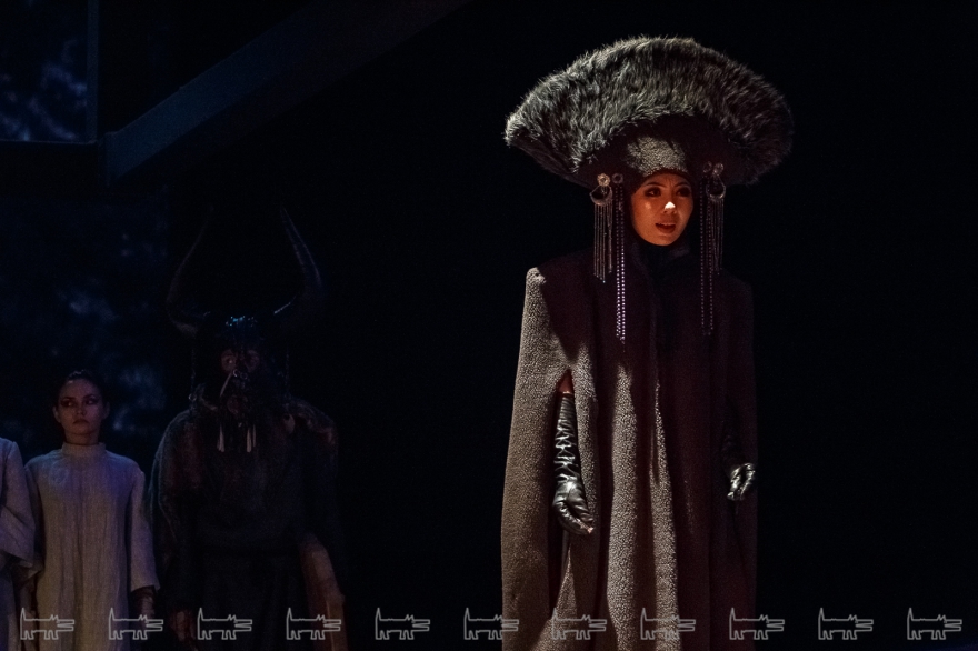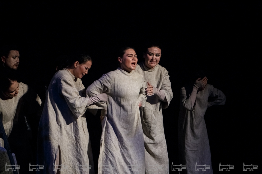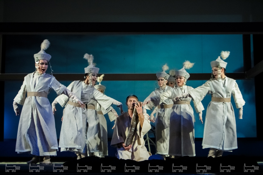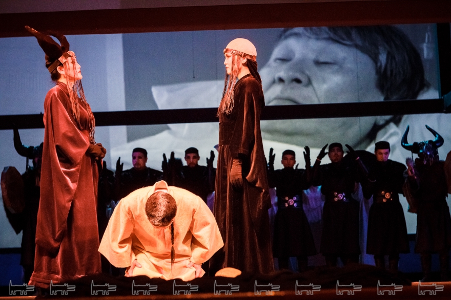 Коркут - герой тюркских народов, поэт-песенник и композитор IX века, по легенде нашедший бессмертие в искусстве. Особенности метафоричной литовской режиссеры Вайткус помножил на казахскую ритуальность, усмирив буйную эмоциональность, характерную для тамошних актеров. Так что на сцене маски, бубны, а ля античный хор соседствовали с видеорядом, кубом-экраном, лазерами, а мусульманские молитвы - выходом некоего языческого бога. А сам Коркут играл не на кубызе, а на гораздо более выразительном по виду полене.