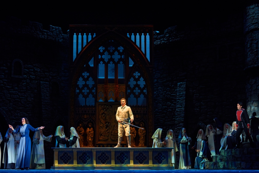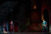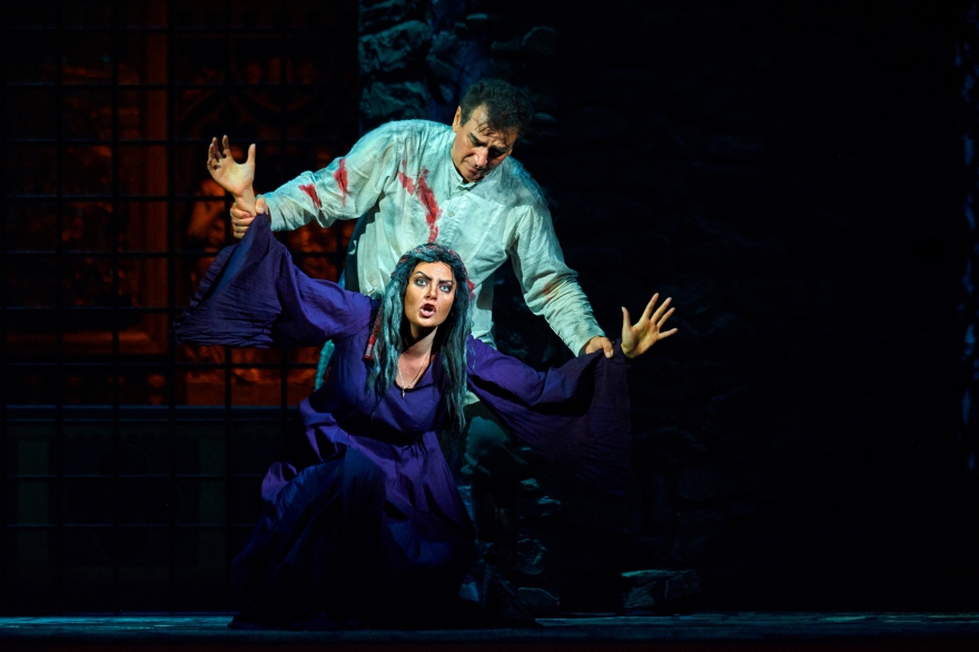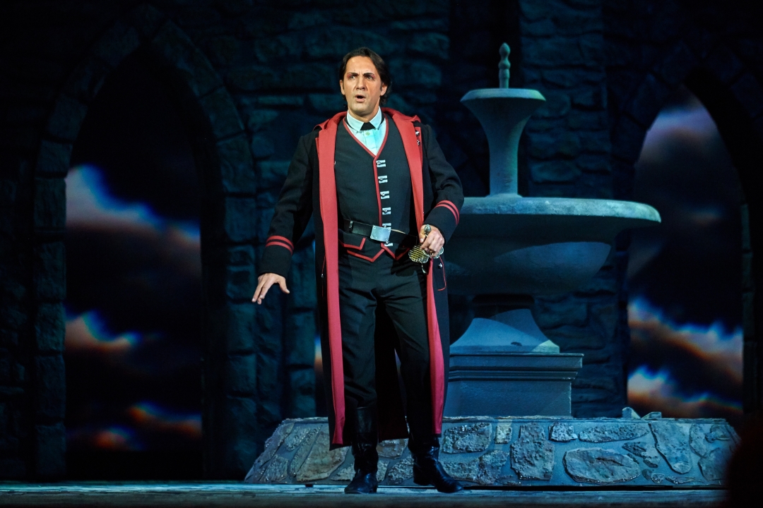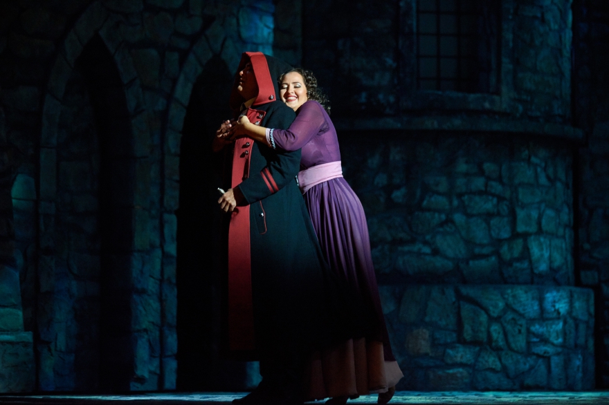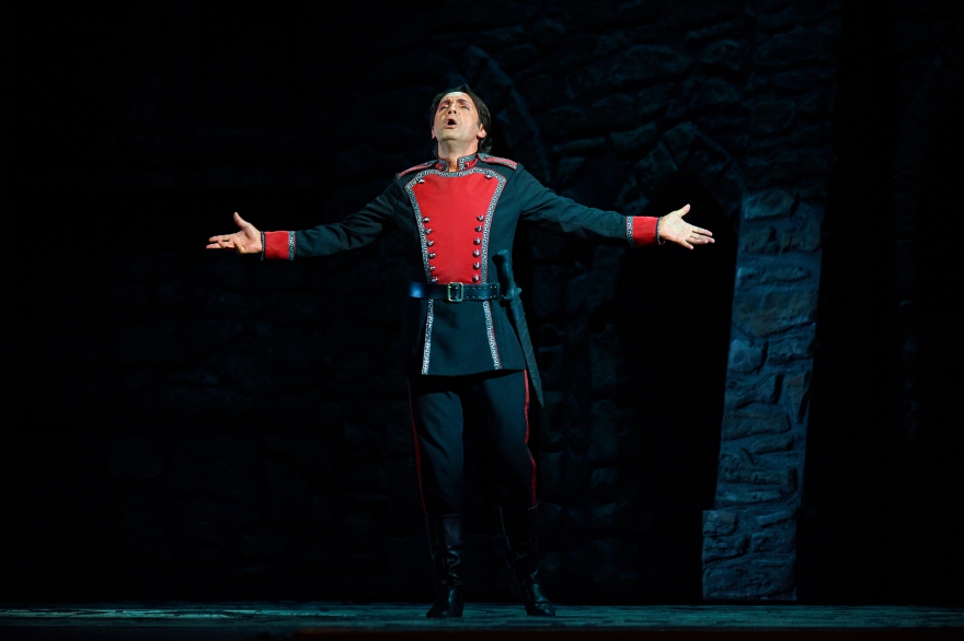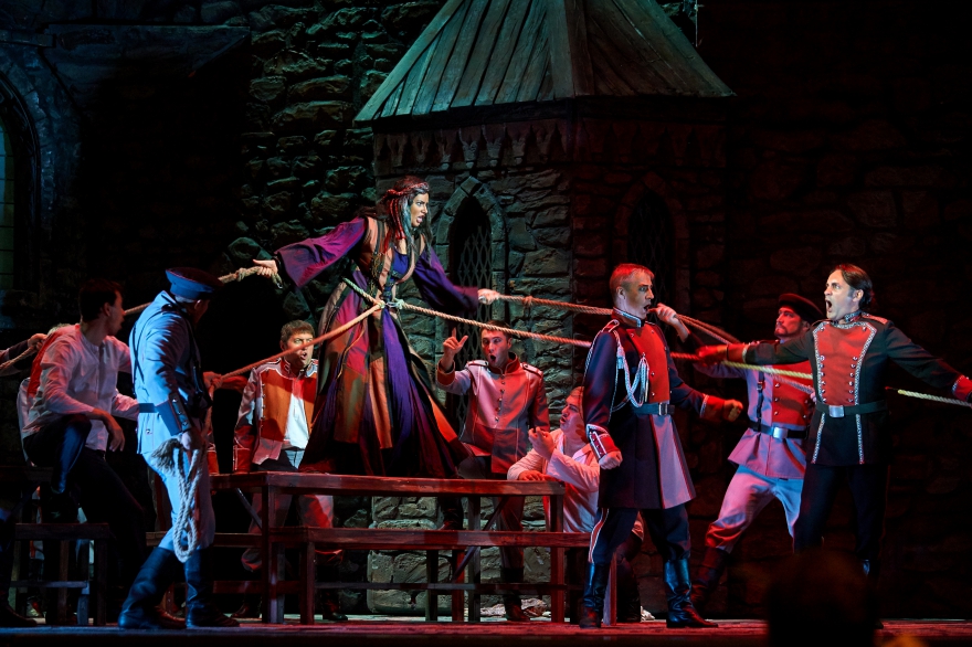 Сейчас спектакль «Трубадур» поставил Ефим Майзель, про которого отдельно строкой прописывается, что он работает с Метрополитен-опера. Дирижирует оркестром москвич Василий Валитов. Как отмечал Майзель, тема «Трубадура» - «сила жестокости». Уровень ее проявляется в первые же секунды, когда раздается истошный крик цыганки, а экран показывает тело в пламени. При этом на заднике не транслируется что-то сверхэффектное, основная сила оформления – внушительные, при этом невероятно мобильные стены замка, которые вращаются вокруг башен, превращаясь то в застенки тюрьмы, то в анфилады собора. Выглядят они достаточно мрачно, чтобы сходу отбросить всякую надежду хоть на какой-то позитивный опыт.