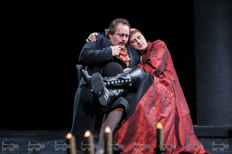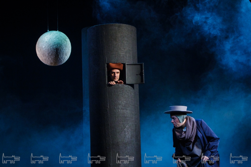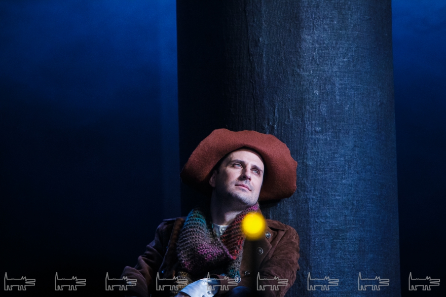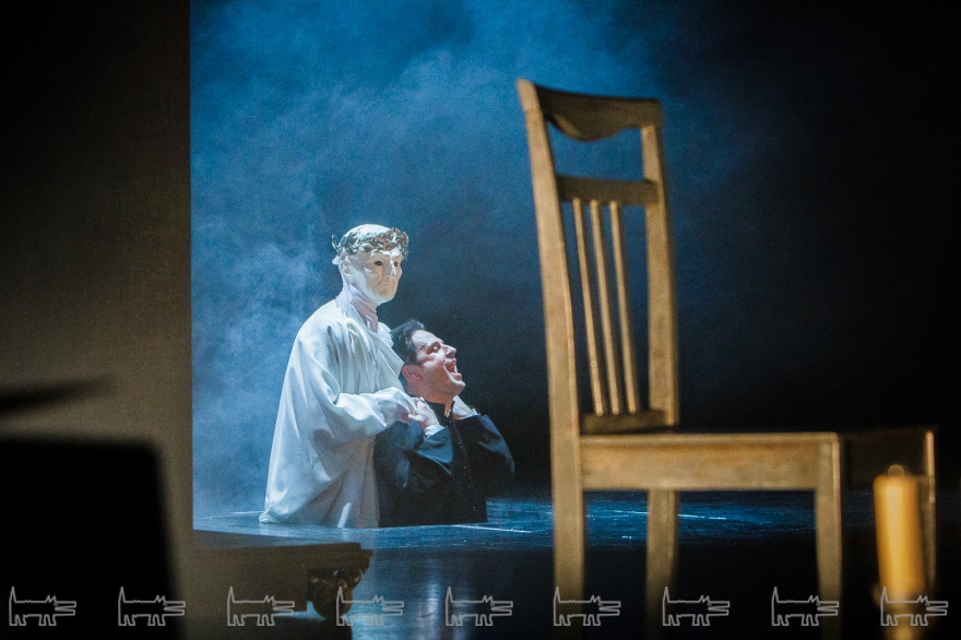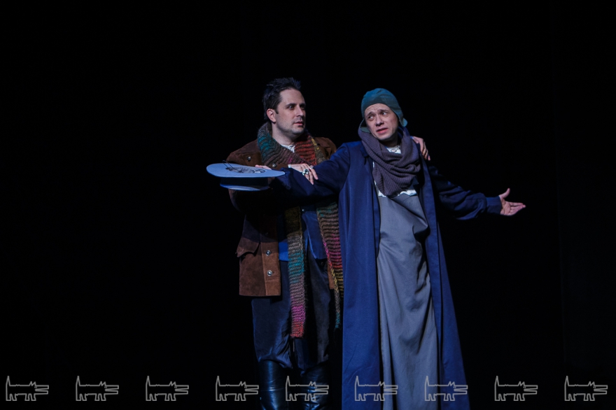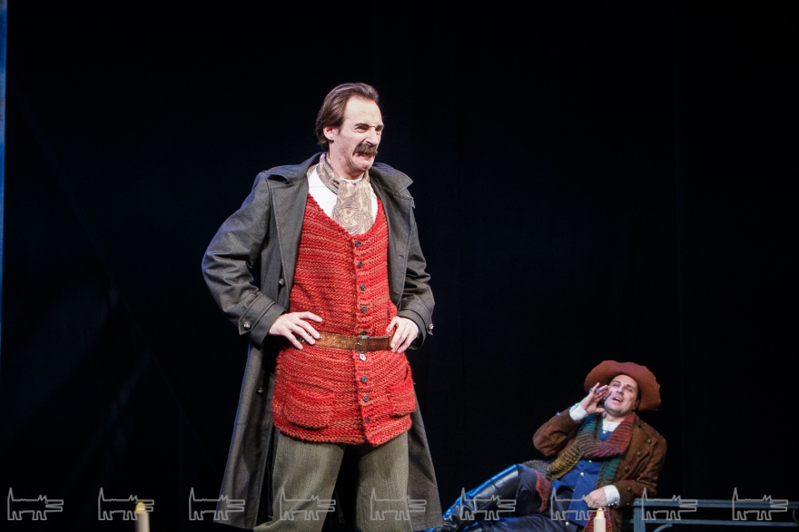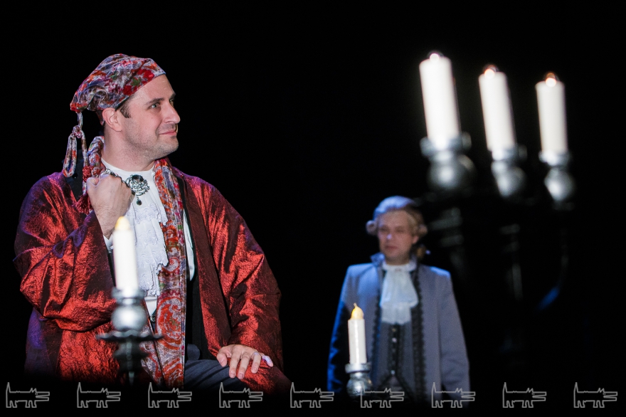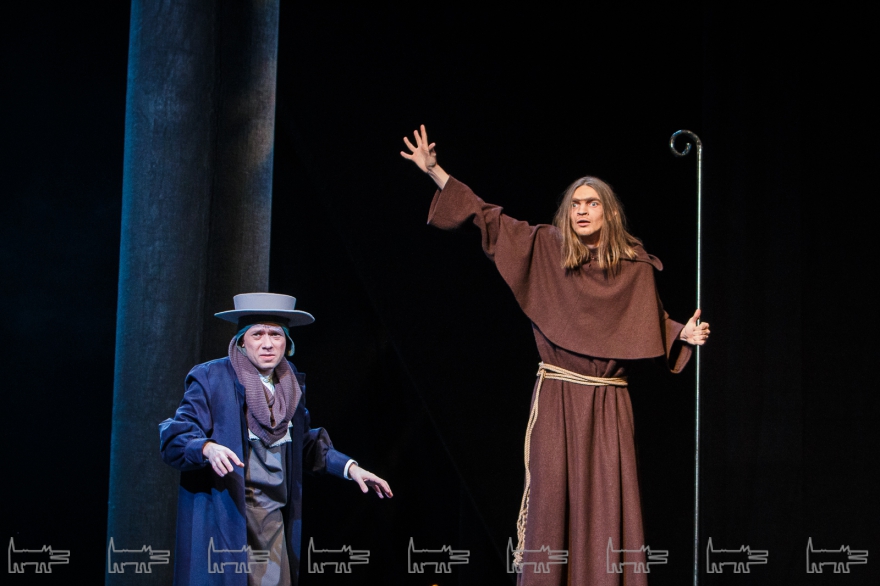 Всему этому вторит Илья Славутский в роли «неверующего ни в Бога, ни в Дьявола» сердцееда Дон Жуана. Несмотря на то, что лицедейство является главным мотивом спектакля, актер проносит роль на грани фарса. Это сложно оправдать поставленной задачей, если только не допустить, что задача была сыграть «плохого актера», который в мистическом исступлении заламывает руки и разговаривает с особым придыханием. То же в разной степени касается и других исполнителей, за исключением, пожалуй, Марата Голубева в роли слуги Дон Жуана, Сганареля, на диалогах с которым строится драматургия произведения.