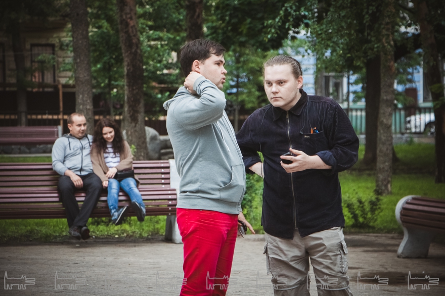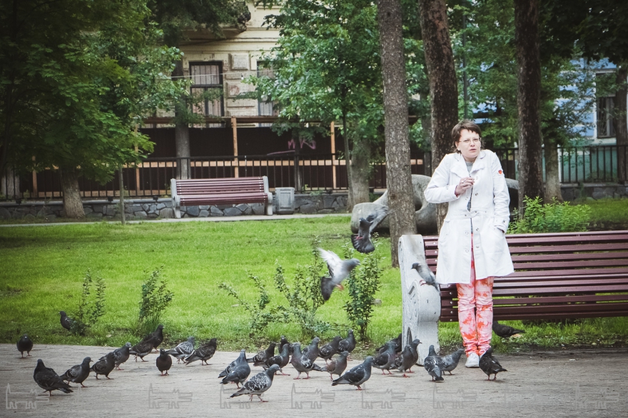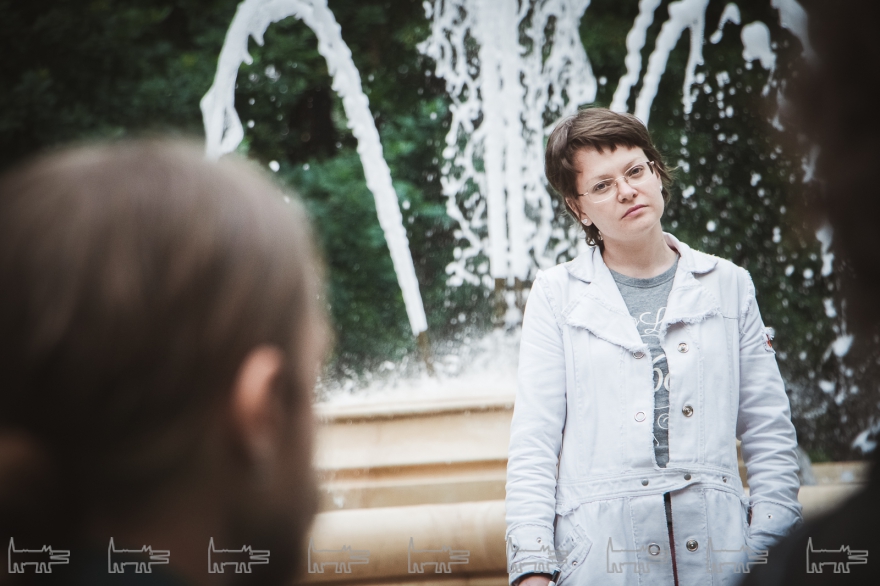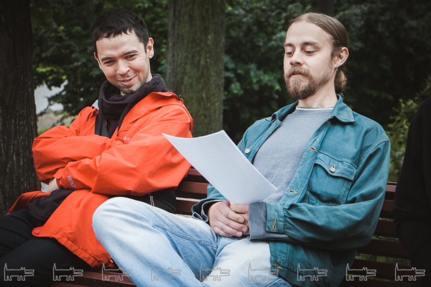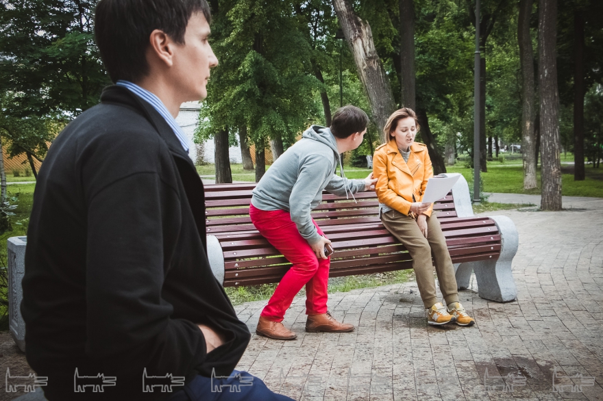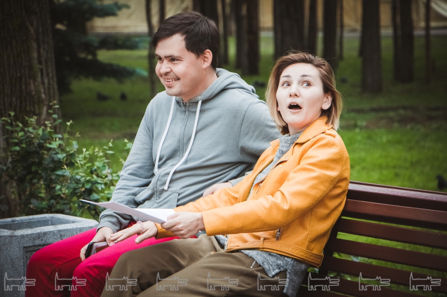 По идее, они должны будут вещать эти истории о любви (написанные всей командой) прохожим в парке – а зрители будут за этим наблюдать. И, надеется режиссер, станет непонятно, кто говорит – актер или просто сумасшедший. «Мы работаем в Доме актера, и в Лядском саду таких людей я видела немало», - объясняет Саттарова. Верно, и сидящие в парке люди будут реагировать – и текст начнет меняться. Все это время на скамейке обитает слегка седеющий мужчина, который держит осанку и просто смотрит на фонтан. Он не играет.
