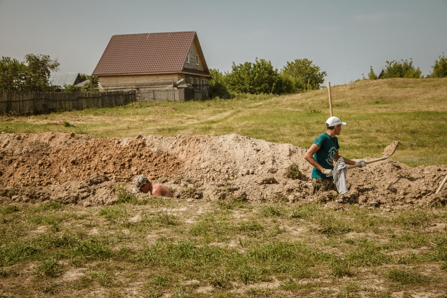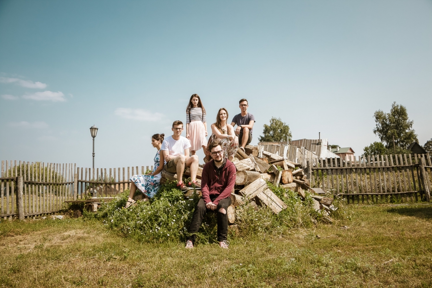 Первым делом команда идет от отеля «Свияга» c его символом - дядей Сашей - к «сиплому псу»: во двор с лодками, кирпичным домом и грустно воющей собакой. Все устраиваются на поленнице, тут же появляется мужчина с голым торсом и мягко интересуется, чего это нам всем тут надо. Уяснив, что всего лишь кадр, удаляется. А команда Волкострелова в моей голове получает название «ВИА "Сиплый пес"».