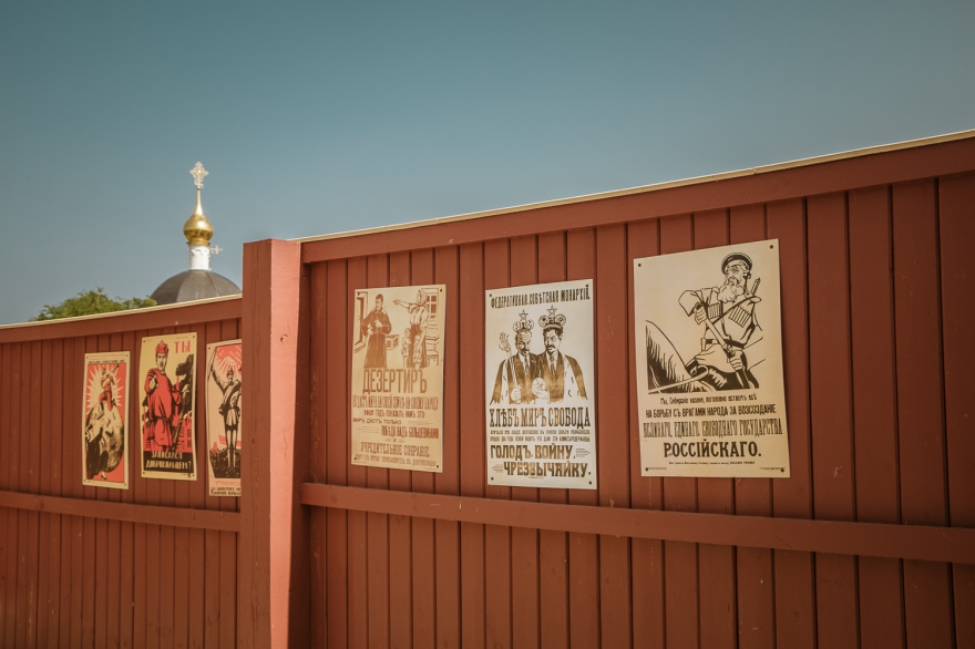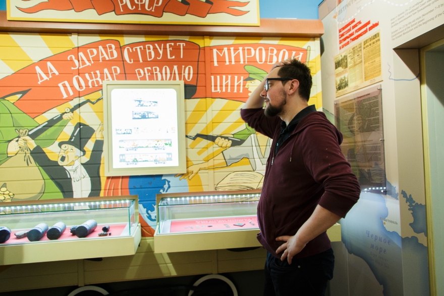 В итоге мы вновь оказываемся у музея - его открыли для съемочной группы. Волкострелова внутри двухэтажного дома Медведевых-Бровкина привлекает знак «Друг детей», а нас - надписи на трех языках и стоящая у окна, рядом с фигурой Троцкого, Лариса Рейснер, тогда комиссар Морского Генерального штаба, политработник Волжской флотилии. Что называется, человек интересной судьбы - поэт, писатель, любовница Гумилева и члена Исполкома Коминтерна Льва Радека, секретарь Луначарского, а позже - участник советской дипломатической миссии в Афганистане.