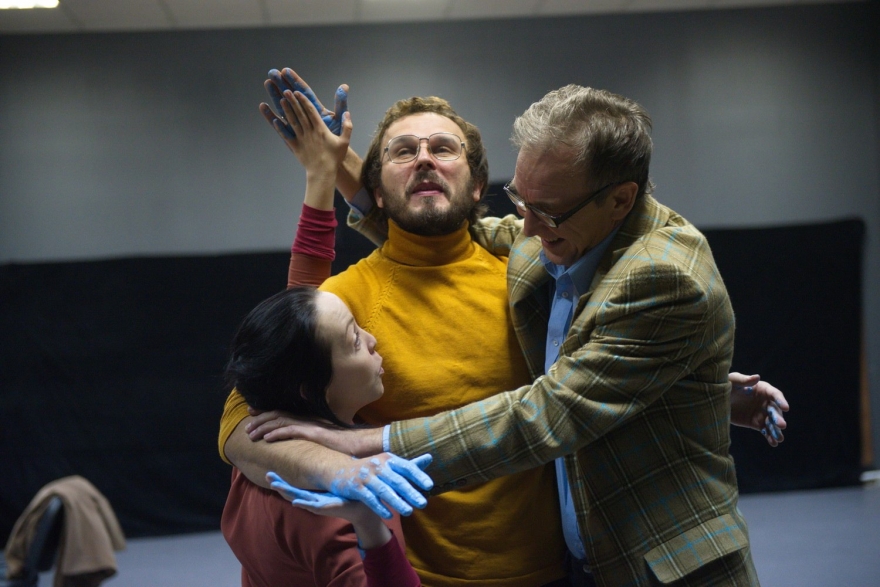 После игр разума режиссер дает хорошую порцию реального - кусок картона, литр голубой акварельной краски, босых ног. Муж Сары Роберт (Анатолий Малыхин) мажет краской своих друзей, мажет реальностью своих друзей. Любопытно, что в идущей в "Театре.Акт" версии "Ос" герои, напротив, проходят обряд очищения. И эта выразительная разница трактовок доказывает пластичность вырыпаевского текста, который еще и зритель может интерпретировать по разному.