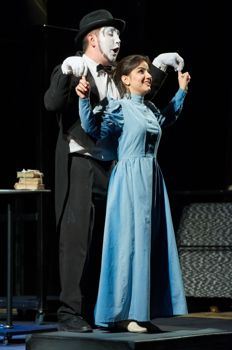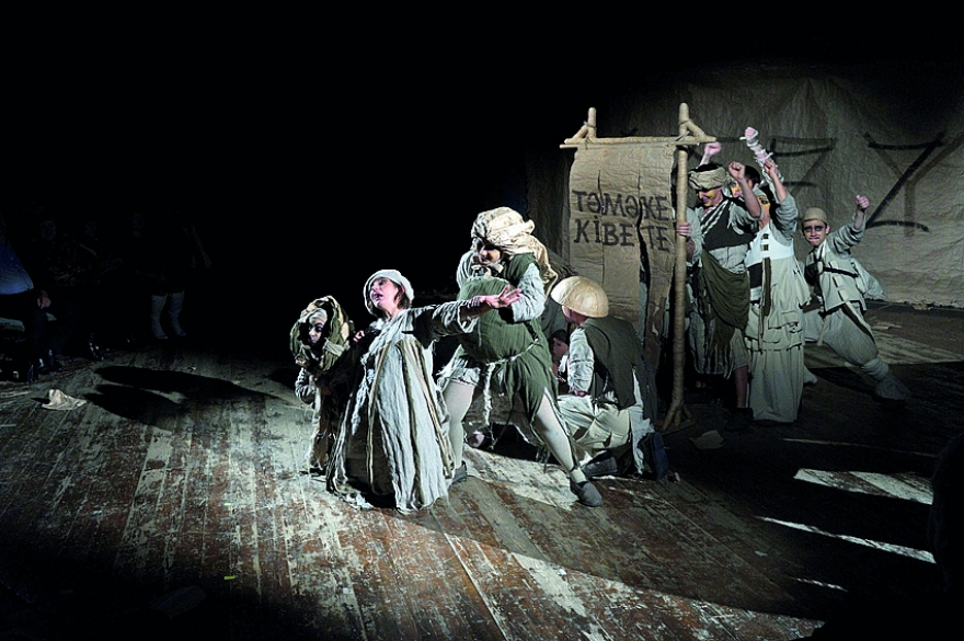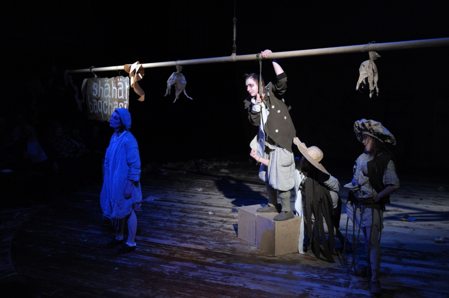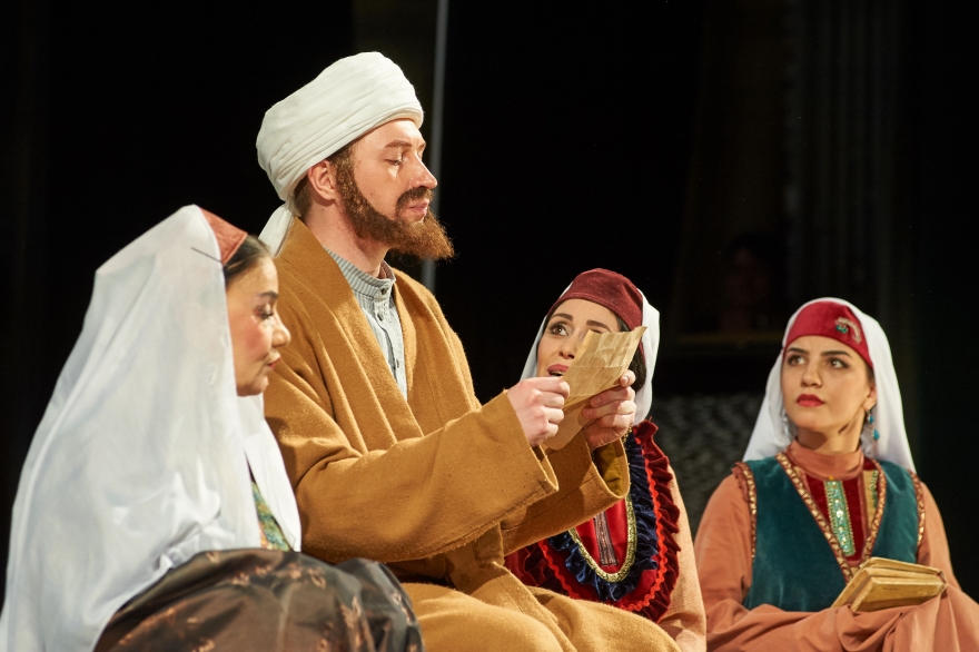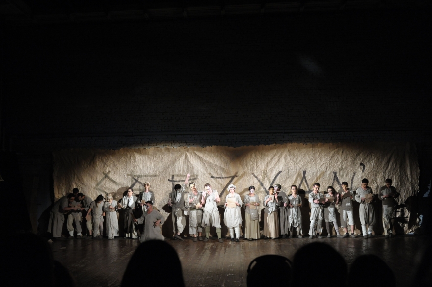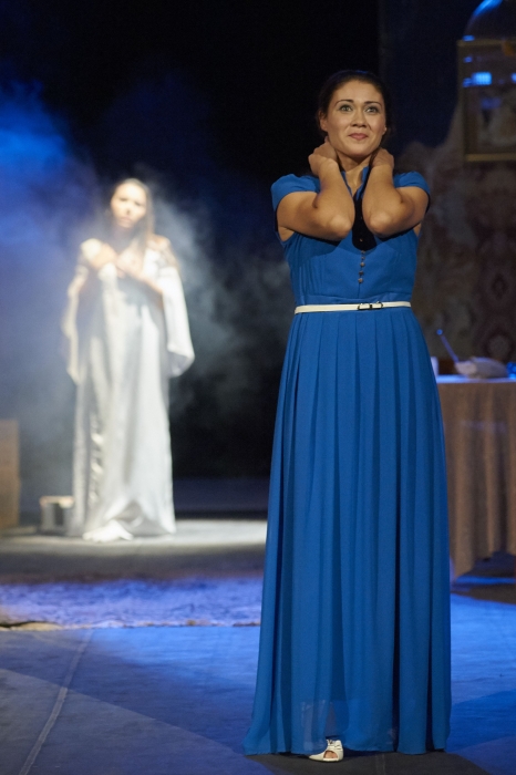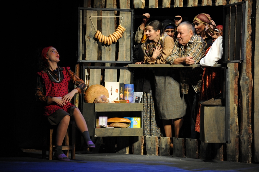 Переведенный на татарский Бертольд Брехт - о том, как в поисках человека с открытым сердцем боги спустились на землю, а нашли только проститутку Шен Те, чья доброта приносит ей только несчастья. Петербургский режиссер Искандер Сакаев рассадил зрителей на сцене, а художник по костюмам Дина Тарасенко обрядила актеров в средневеково-космические костюмы.
