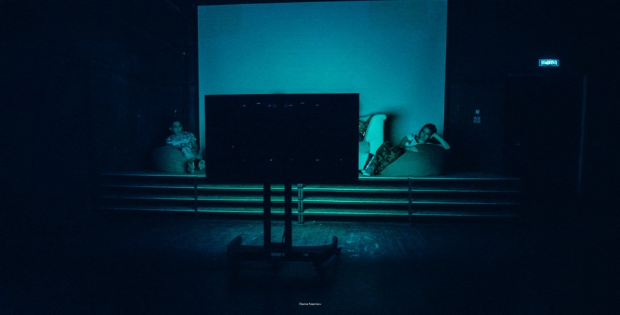 Самое сильное в пьесе — это пространство. Зрители смотрят на как бы актеров, которые как бы смотрят телевизор, экран которого невидим для зрителей. Режиссер как бы говорит — а вы попробуйте догадаться, что видят герои? (Кстати, раз уж в новой драме все как бы наоборот, то какое слово использовать вместо «герой» и «роли»? «Ничтожества» и «трансляции»?) Постарайтесь, намекает он, через эти куцые фразы ощутить себя современной молодежью, посмотреть их глазами на экран будней. Но одновременно зрители все время смотрят и на задник телевизора, который “лицом” смотрит на актеров. К концу пьесы, когда уже хочется спать, непонятно, кто кого считывает.
