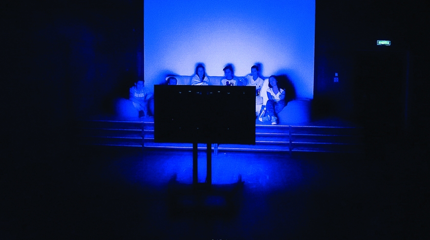 Перед залом на диване и пуфиках расположилась стайка ребят старшешкольного-раннестуденческого возраста, которые как бы смотрят в большой телевизор, отделяющий их от зрителей. Последние, в зависимости от места расположения, видят часть ребят и заднюю панель экрана. Но ребята, на самом деле, телевизор не смотрят, они говорят, даже скорее щебечут, о своем ребячьем. Есть эпизоды, где речь идет о каком-то экране, но много и диалогов, не связанных с наличием зомбоящика.