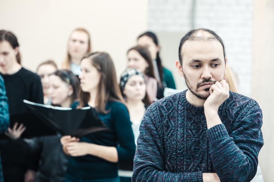 С хором мы провели всего две репетиции, нам удалось добиться синхронизации благодаря проработанной структуре. Каждый вносил что-то свое - наш хореограф Марсель Ибрагимов, руководитель хора музыкального колледжа Дина Венедиктова, композитор Эльмир Низамов. Мы попытались передать красоту языка через буквы, фразы, реплики. Здесь много поэзии, а ее каждый понимает по-своему, здесь есть и сюжетное восприятие, и эмоциональный слой, и третий слой, связанный с другими энергиями. Словом, здесь и Станиславский, и Брехт, и Брук.