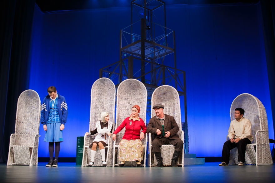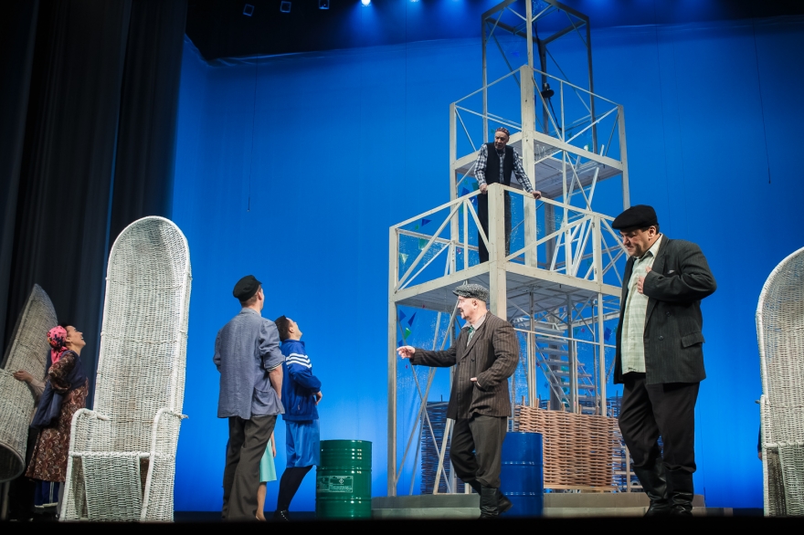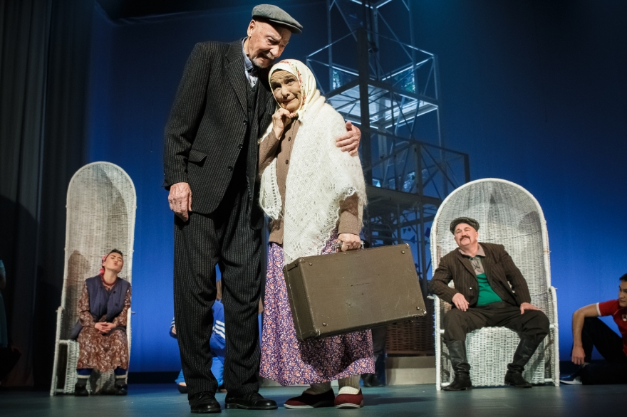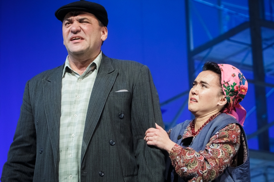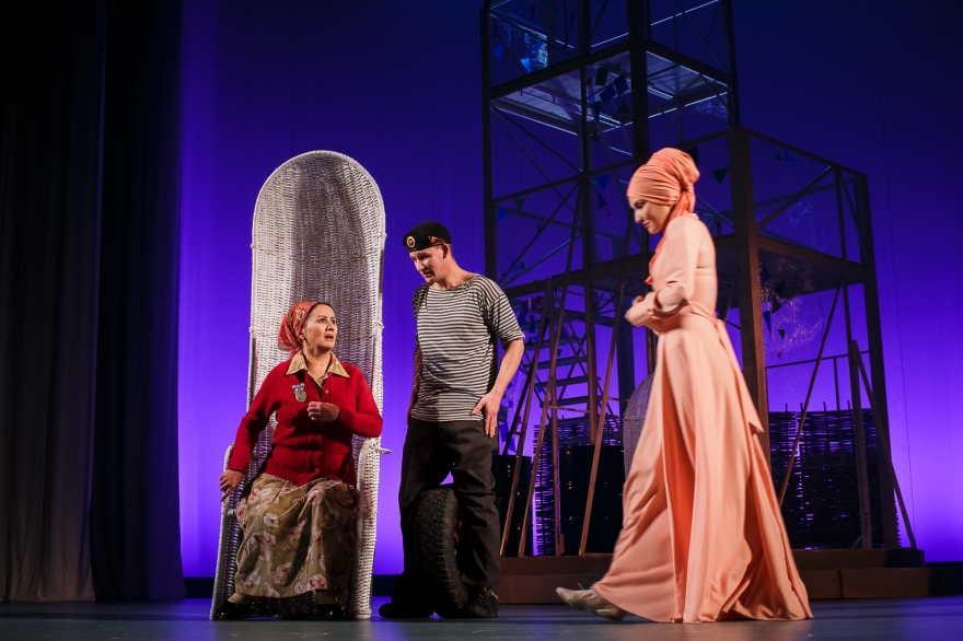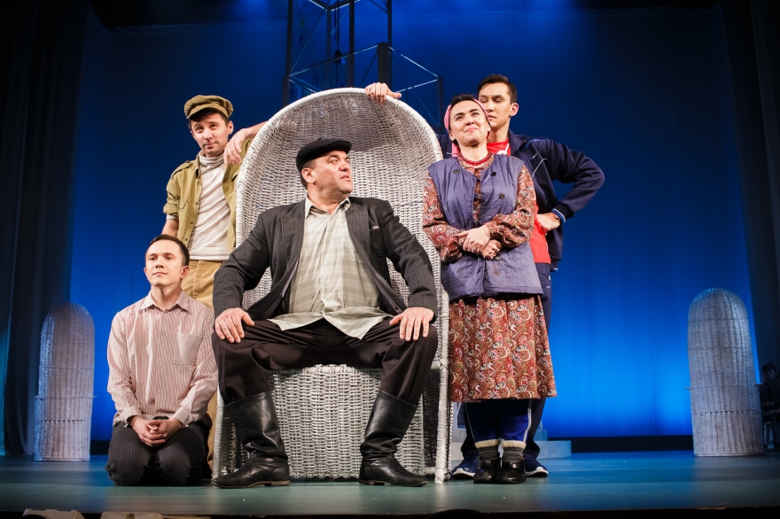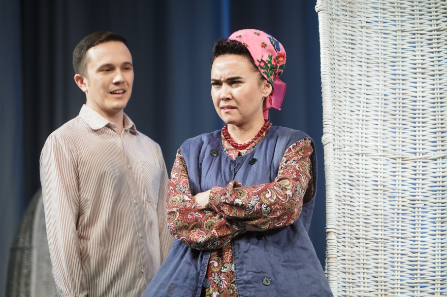 Десять лет Рамиль Тухватуллин, коронной ролью которого был Булат в «Голубой шали», снимал кино, работал чиновником и даже оказался в Качаловском. Теперь же на сцене он поет в новом спектакле с нынешним Булатом, Ришатом Ахмадуллиным: Эльмир Низамов сочинил несколько песен в духе американских мюзиклов — скажем, про любовь к огурцам в стиле соул. Все вместе поначалу кажется красивым оммажем к постановкам девяностых с элементами шоу, но чем дальше, тем меньше в происходящем времени, а больше вопросов.