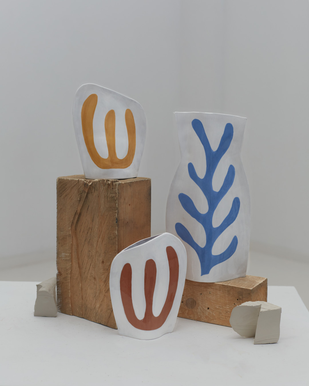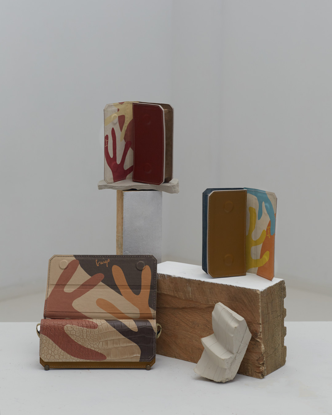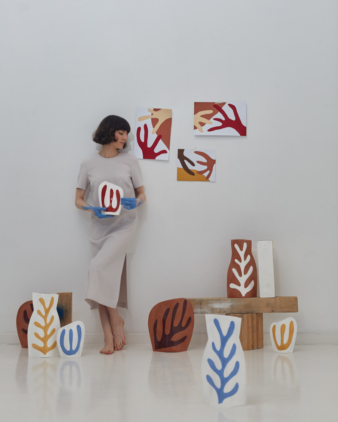 В коллаборации представлено по 8 сумок и ваз, объединенных не только общими цветовыми решениями и рисунками, но и любовью девушек к работе руками. Узоры на сумках натуральных оттенков охры, кирпичного и бежевого покрывают кожаные подклады, а керамические вазы — двусторонние по цвету и в более ярких тонах — полностью расписаны вручную.