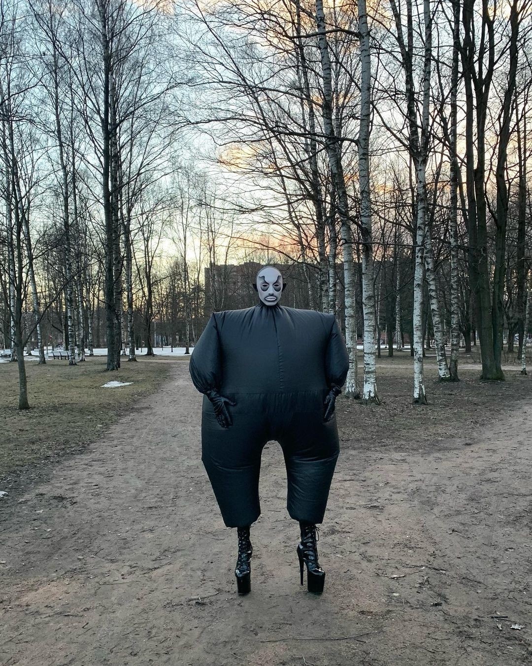 Надувной продавался готовый — его на AliExpress можно за тысячу рублей купить. Мне очень понравилась эта тема с костюмами, на днях должен прийти новый — латексный. Думаю, прикольно переодеваться в уже готовые костюмы, которые я не вижу в обычной жизни. С надувным получилось так: я зашел на AliExpress, смотрю — сумоисты, подумал, что прикольно, хочу себе видео, фотки в таком костюме, заказал. Я сначала снял в нем видео дома, потом решил выйти на улицу — получилось что-то типо челленджа. Написал в тиктоке, что появлюсь в костюме публично за миллион лайков. Для меня тогда это была невозможная вообще цифра. Бац, за три дня у меня миллион лайков. Я думаю: ладно, иду на улицу. Вообще было классно — мы бегали, смеялись, люди тоже ухахатывались, не понимали, что происходит. На днях я снимался в этом же образе для петербургского бренда Sintezia, но все — на этом оставлю историю с надувным костюмом.