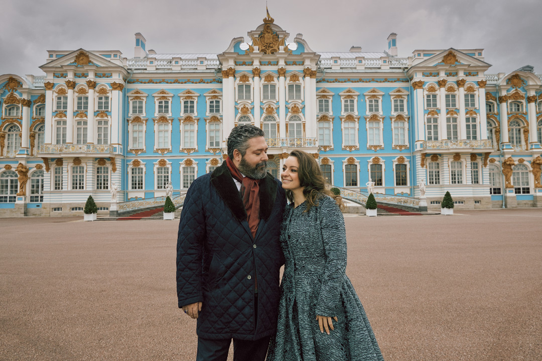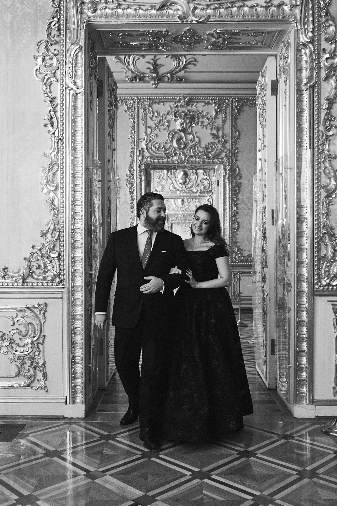 Наше знакомство с четой началось за три дня до венчания — на эксклюзивной съемке для «Собака.ru» в Екатерининском дворце, в день, когда музей был выходным, но открылся специально для нас. Место выбрали неслучайно — в Царском Селе родился прадедушка великого князя. В ожидании пары мы с фотографом Данилом Головкиным гадали, что должен чувствовать человек, который понимает, что вся эта роскошь могла бы и сейчас принадлежать его семье. За десять минут до этого, чудом избежав лишения прав за нарушение правил дорожного движения, я размышляла, что жизнь несправедлива: настолько разным может быть лишение прав и насколько разными могут вообще быть эти права. Эти философские раздумья были прерваны прибытием джипа ярко-голубого цвета. Намек на цвет крови? Мэтч с бирюзой Екатерининского дворца? Выглядело это, в любом случае, довольно эпично.