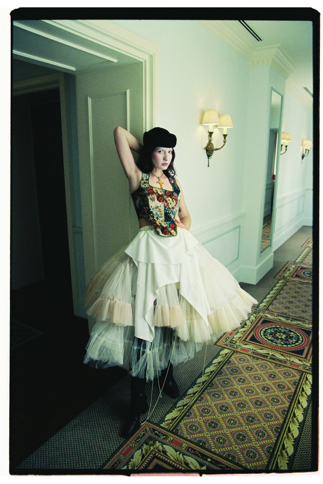 Корсет под грудь круто идет с черным базовым платьем, скорее облегающим — это универсальная штука, тут нельзя промахнуться. Корсет на бретелях — с белой рубашкой с мужского плеча, джинсами-трубами, брюками палаццо или сигаретами. Лично мне нравится, когда люди играют с принтами и фактурами, несмотря на самодостаточность гобеленовых корсетов. Например, одна моя клиент- ка сочетала его с юбкой-трапецией, на которой была цветочная вышивка: она перекликались с принтом на корсете, и это создавало классный эффект в сочетании с колготками с орнаментом. Если нужен вариант на осень, то это сочетание корсета, плотной водолазки и жакета мужского кроя.