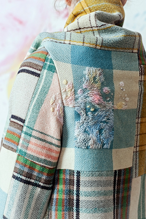 Коллекция «Художник дома» — четвертая из моих «модных» серий, ее я сделала с дизайнером Ольгой Глаголевой, основателем экобренда GO. Все вещи — из вторичных материалов и перерабатываемых натуральных тканей. Мы придумали историю про девушку-художницу, которая живет в своей мастерской и носит рабочую домашнюю униформу, всю в пятнах краски, которая, если присмотреться, оборачивается вышивкой. Мы шили ее долго и сложно, в общей сложности год, ткани Ольга присылала из Лондона, на каждую вещь ушло около ста часов работы. Все луки существуют в единственном экземпляре, мы не преследуем сверхкоммерческих целей, для нас это картины, которые можно надеть и пойти гулять. Сейчас я начала работу над расшиванием линии нижнего белья и корсетов February First, которую выпущу после того, как в апреле вернусь с персональной выставки в Сингапуре».
