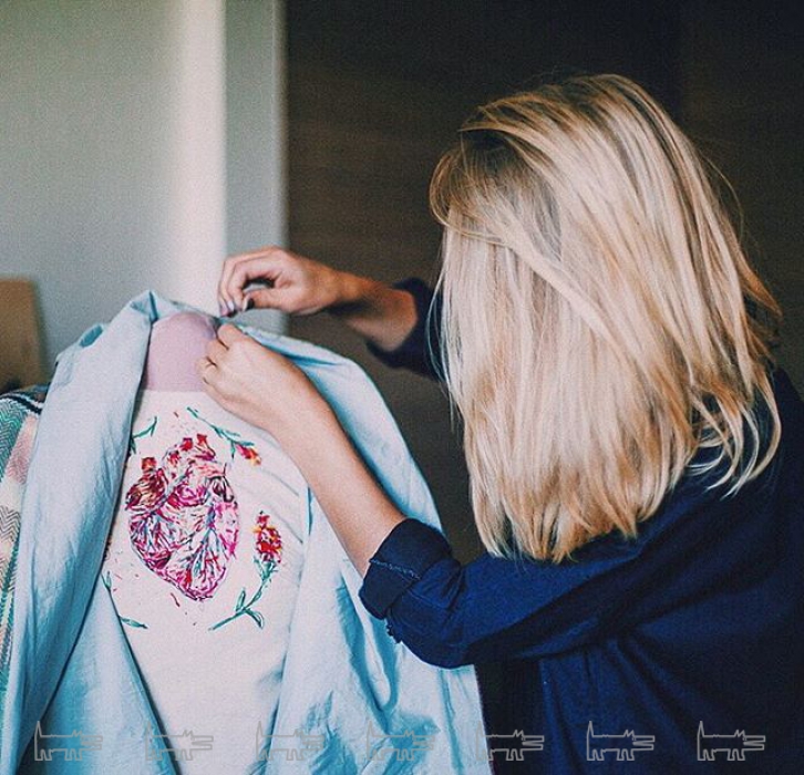«Меня часто спрашивают, как называется техника, в которой я работаю. Формально это похоже на гладь, но я отвечаю: дрессированные нитки. Я делаю эскиз, потом перевожу основные линии на ткань карандашом, очерчиваю контуры и заполняю форму цветом и линиями. Яучилась в Театрально-художественном училище в Москве, мы много шили и рисовали. Шить было скучно, рисовать у меня не очень получалось, и в какой-то момент все это объединилось в рисование нитками. Тогда мне не нравилось, что рисунки не имеют никакой практической функции, на стену вешать их не хотелось, именно поэтому я стала расшивать одежду, а теперь круг замкнулся и я вернулась к тому, что могу просто вышить картину.
