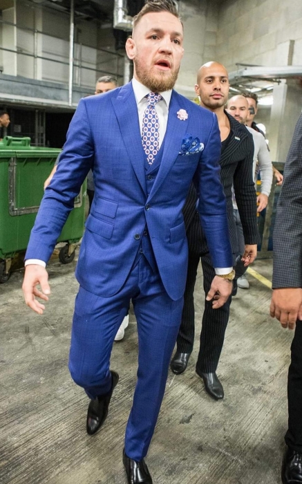 Взяв пару уроков у профессионалов, Конор стал выбирать одежду самостоятельно, а позже нашел себе личного портного — Дэвида Огуста Хейла. Предметом совместной работы атлета и швеи стали костюмы — именно они создавали необходимый шок-эффект и приковывали к МакГрегору взгляды миллионов. «Что? Спортсмен в смокинге? Не смешите меня!», — язвили скептики в Instagram. Конечно, особенно если вместо полосок на шерстяной темно-синей ткани зашифрована фраза «F*ck you» — в таком костюме Конор впервые встретился со своим соперником Флойдом Мейвезером перед первым боксерским боем. Мейвейзер был в худи и трениках, что спровоцировало оппонента на дополнительную порцию сарказма: «Посмотрите на него, он пришел в чертовых спортивках! Даже не может позволить себе костюм!».