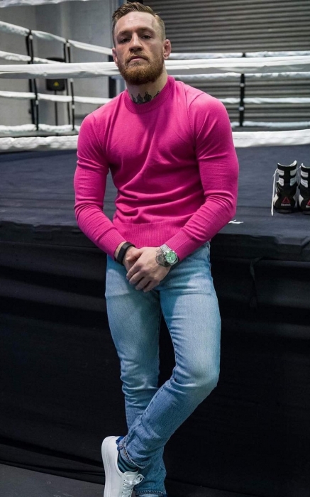 Розовый джемпер МакГрегор носит с таким лицом, что ни у кого не возникнет желания попросить его «пояснить за шмот». Он в принципе обожает «бесполую» одежду — свитшоты с нашивками, яркие бадлоны и аляповатые кофты с сюрреалистичными принтами . Коди Гарбрандт — еще один чемпион смешанных единоборств — тоже не прочь носить голубые джемперы и костюмы от David August, но без харизмы Конора выглядит в них, по меньшей мере, нелепо — МакГрегор сразу нокаутирует соперника.