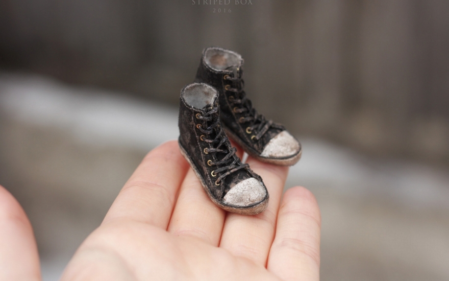 Все свои работы Татьяна выкладывает в группу «Полосатая коробка» в социальных сетях, где также раскрывает процесс их создания и записывает видео-мастер-классы. Например, недавно девушка показала коллекцию «негнущихся» пластмассовых подошв и процесс зашнуровывания ботинка на ноге куклы. Там же можно заказать мини-одежду и обувь, которая стоит дороже, чем оригинальная: так, за кожаные сапоги размером в мизинец придется отдать 175 долларов, а их поношенная версия стоит на 10 единиц дороже.