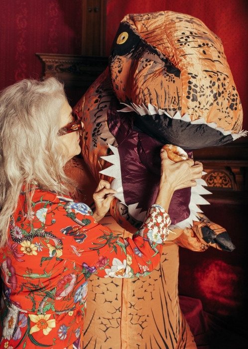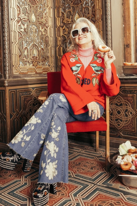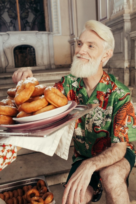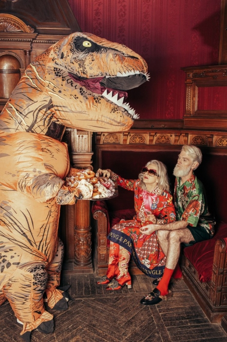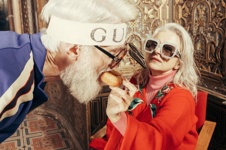 Модели агентства Oldushka — 45-летний Сергей Арктика и 61-летняя Татьяна Неклюдова — снялись в кампейне «Пышечки» (Ginza Project) из Петербурга. Никаких избитых семейных фото, кухонного антуража и лозунгов о вкусной сахарной пудре — в центре кадра хиты от Gucci, ростовая кукла-динозавр и фрески Особняка Брусницыных. Татьяна, которая летом этого года позировала для рекламы нижнего белья, теперь одета в туфли на платформе, джемпер Loved самого модного оттенка сезона и расклешенные джинсы. Сергею досталась шелковая рубашка с тиграми, брендированная повязка и «миллениальные» брюки с лампасами, чтобы удобно сжигать набранные за поеданием пышек калории.