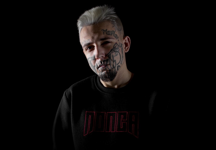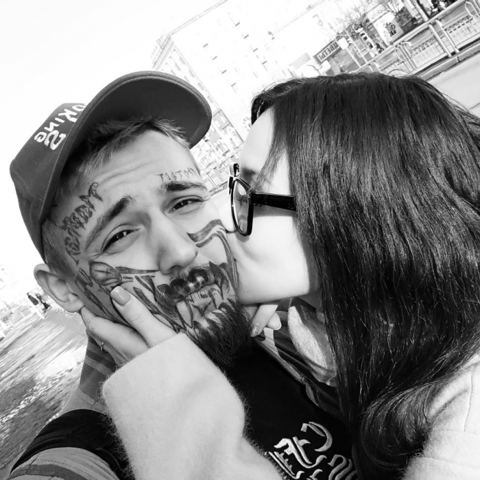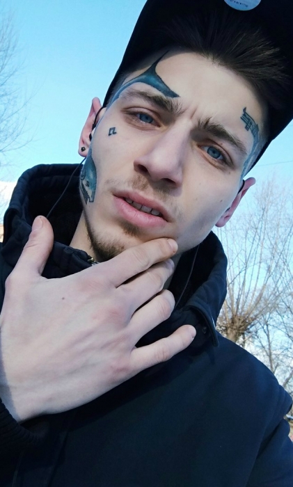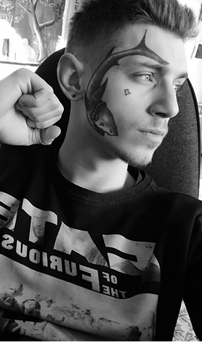Первую татуировку в 18 лет мне «подарила» мама, а в 19 я уже начал забивать лицо — «гробом», фамилией, надписью «Протест». Мне понравилось, как на меня реагировали люди, чувствовал себя уверенно и комфортно, хотелось набивать еще и еще. Как-то мой мастер спросил «зачем это все?», а я ответил «нечего терять». Через какое-то время мы уже делали эту фразу у меня на лице — теперь она занимает его большую часть.