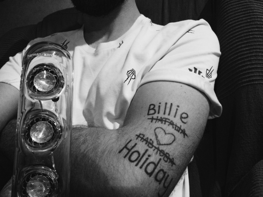 Говорят, любовь живет три года. На моей руке она прожила в шесть раз меньше. Водоворот чувств — вещь не самая стабильная, так что через полгода после той «пати» наши с Наташей корабли разошлись. Сводить партак не хотелось — добавил новый контекст. Обожаю старую музыку и особенно записи Билли Холидей, поэтому «Наташа Павлова» была зачеркнута, а на руке появилось имя певицы.