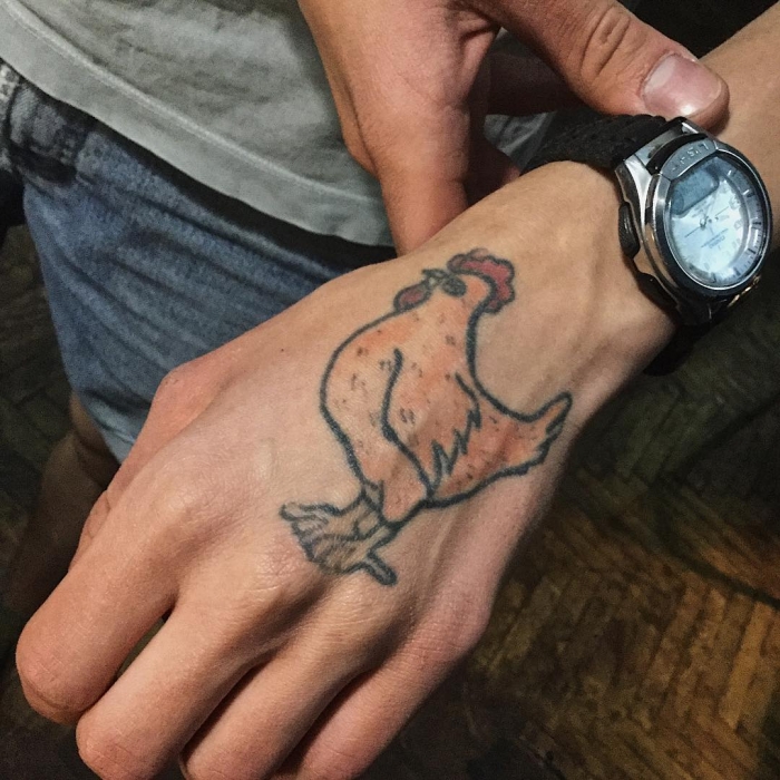 Не знаю, почему, но я очень захотел набить себе цыпленка. Мечта сбылась в «гиковском» баре «Ключ», на месте которого сейчас расположена «Танцплощадка» — там проходила «партак-пати», на которой можно было сделать татуировку за 1000 рублей. К моменту, когда я сел к мастеру, я был изрядно пьян: единственное, что смог найти в интернете — это картинки с изображением курицы или петуха. Так и вбивал в поисковик: КУРИЦА.