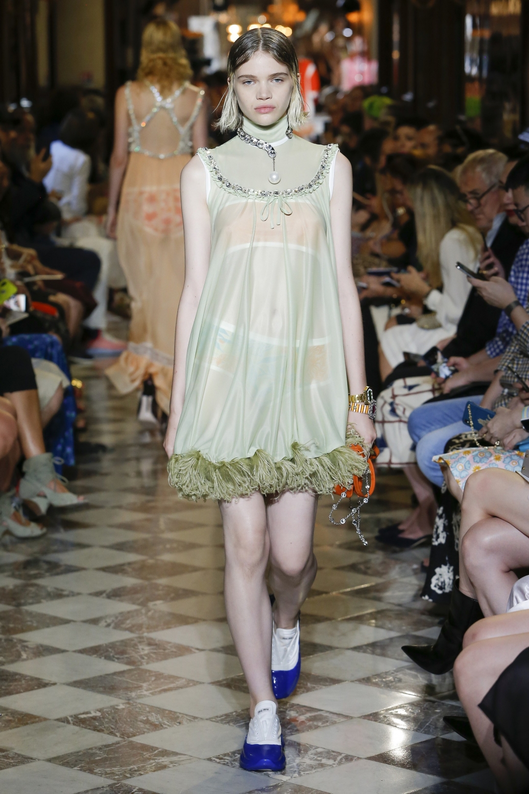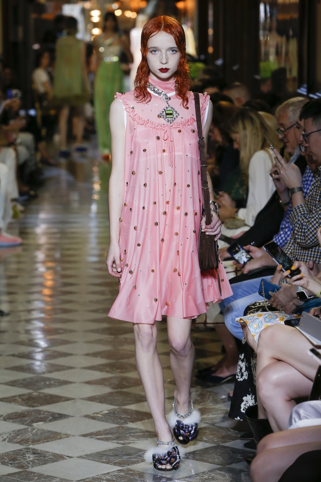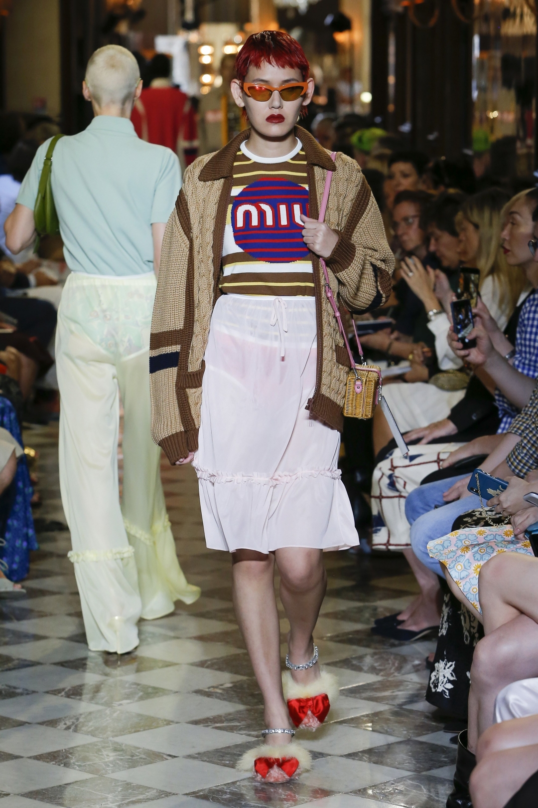 Оказалось, что неспроста: Миучча Прада соединила в коллекции все стереотипы о девушках легкого поведения. Будуарные халаты, страусиные перья, длинные перчатки, леопардовые платья, просвечивающее нижнее белье и серебристые босоножки на высокой платформе чередовались одни за другими или собирались в единый тотал-лук. Назвать его пошлым получалось с натяжкой: где-то спесь сбивали вязаные кардиганы, где-то — школьные гольфы, а где-то — юбки с котятами, но главную роль в разрушении стереотипов сыграли звездные гости, которые в этот раз не только сидели во фронт-роу, но и ходили по подиуму.