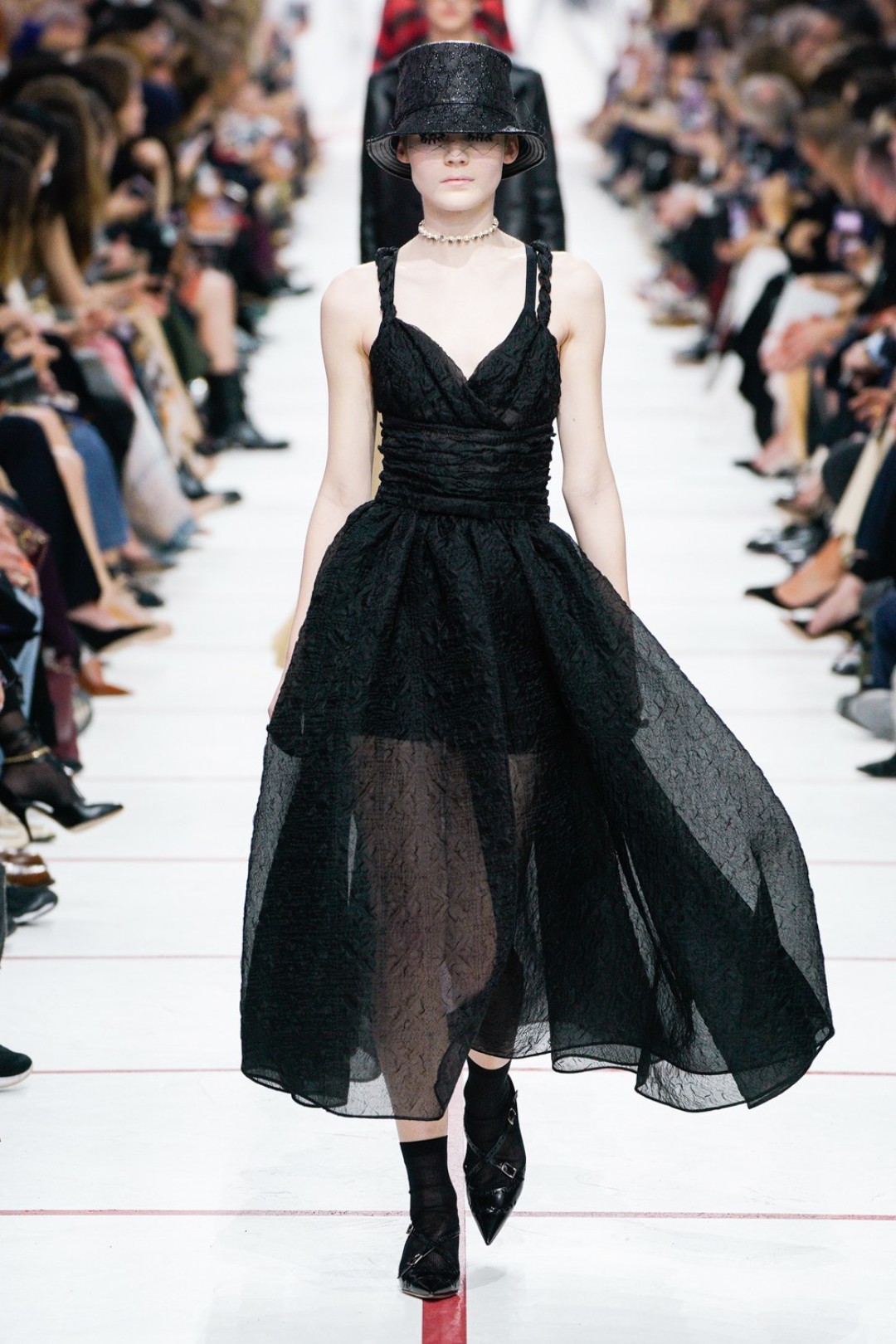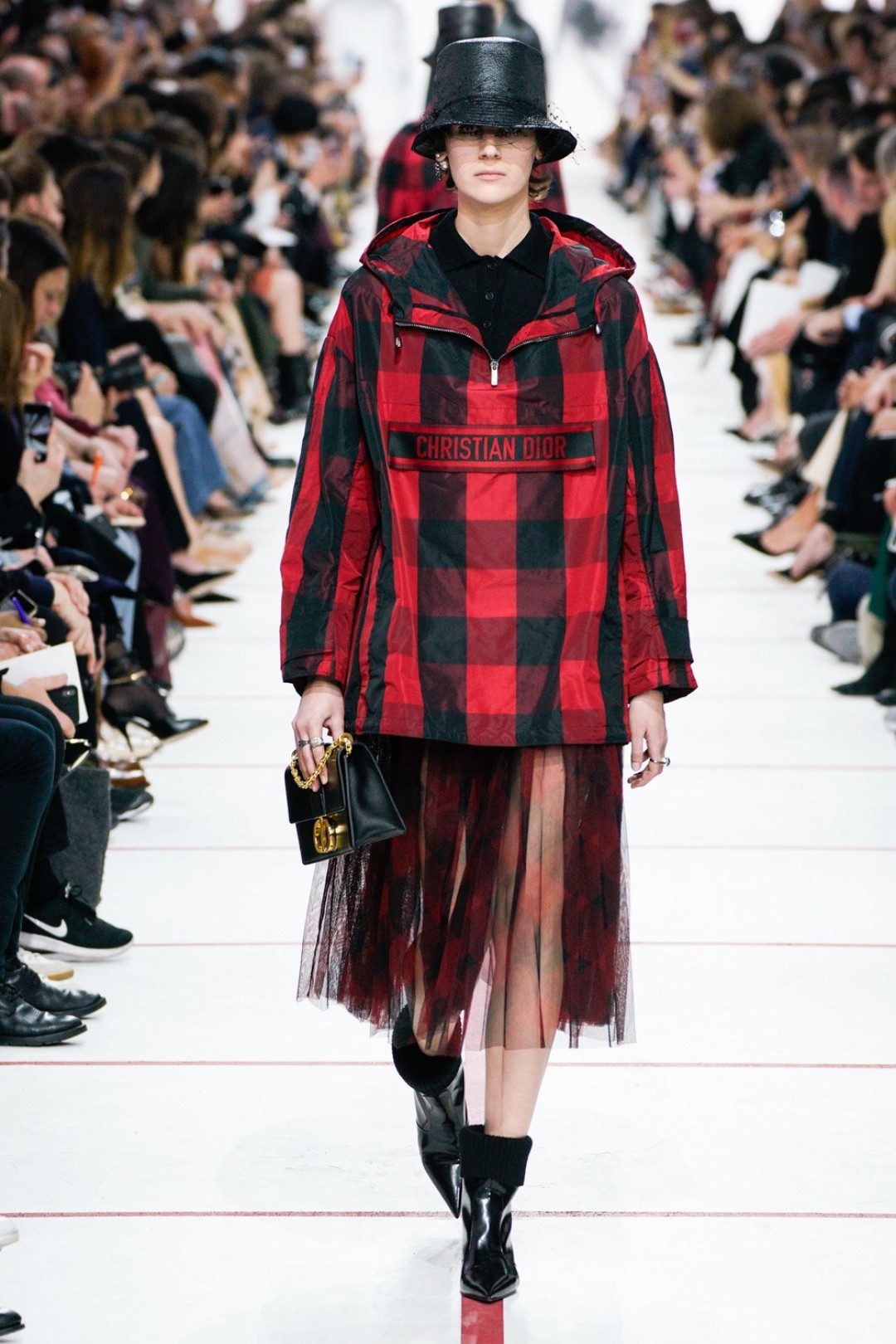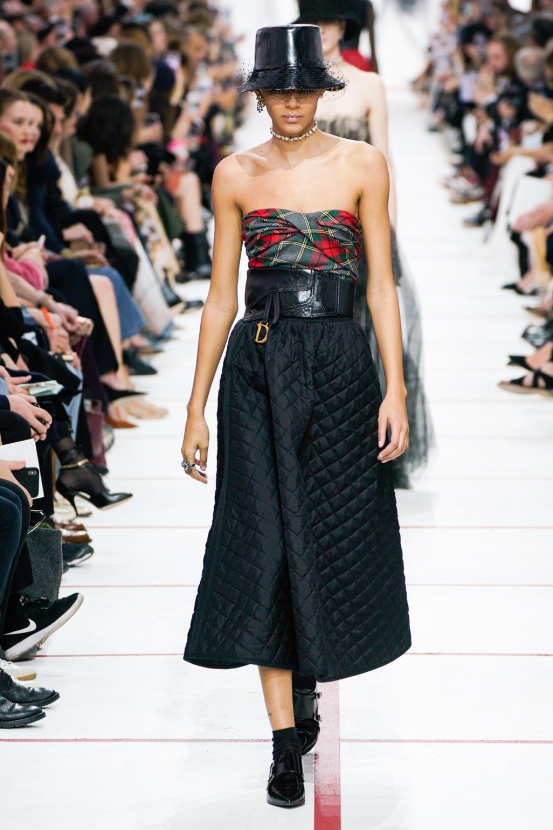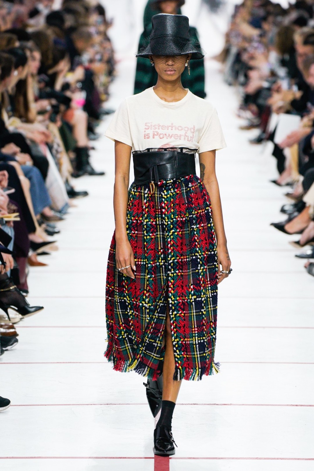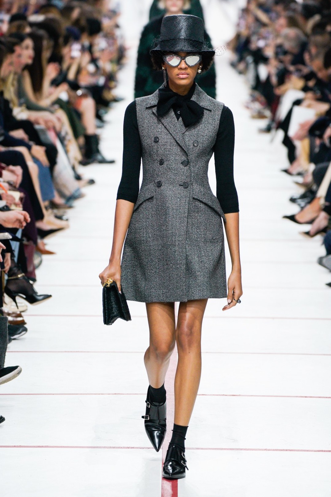 В новом сезоне Мария Грация нафантазировала стеганые юбки, перетянутые «поясной» версией сумки Saddle, клетчатые анораки, стилизованные панамами с вуалью из сетки, и кашемировые свитеры пастельных тонов, надетые на платья с вышивкой тропических мотивов. При подготовке осенне-зимней коллекции дизайнер думала о скончавшемся Карле Лагерфельде, с которым познакомилась в Fendi в возрасте 25 лет, а также о том, как он мастерски интерпретировал ДНК сразу трех модных брендов. Дизайнер взяла за основу коллекции главный код Christian Dior — романтический силуэт из 50-х, замешав его с еще одной страстью основателя бренда — Англией. Кристиан Диор, по его собственным словам, «любил английские традиции, английскую вежливость и английскую архитектуру», а еще — наряжать английских принцесс — например, принцессу Маргарет, чей портрет в дизайнерском платье озаглавил выставку «Christian Dior: Designer of Dreams» в Музее Виктории и Альберта.