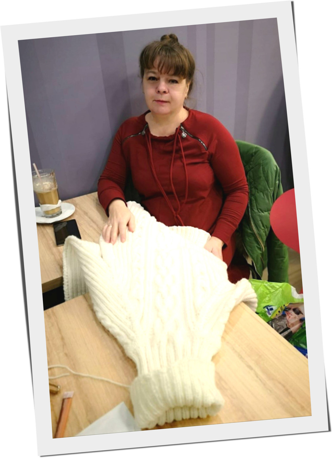 Я научилась вязать еще в школе: в дефицитные 1980-е очень хотелось иметь модные вещи. Первое связанное изделие — гетры с орнаментом для аэробики. А потом я уже вязала не столько для себя, сколько для семьи в голодные 1990-е. Мои дочки (у меня их трое) были самые модные и гордые потому, что мама вязала им индивидуальную, авторскую одежду. Сейчас уже пять внуков хвастаются друг перед другом, кому бабушка больше и красивее навязала. Но этот процесс для меня — еще и способ заработка: я воспитываю ребенка с ДЦП и оплачиваю дорогостоящую реабилитацию. О проекте узнала от мамы такого же особенного ребенка, и сейчас вяжу много и с удовольствием, спицами и крючком. Умею плести кружева на коклюшках в вологодской технике, но больше всего мне нравится вязать фирменный свитер проекта с жаккардом. Он получается очень душевный и теплый!