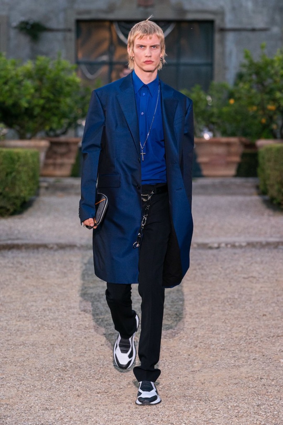 Первый мужской показ Клэр Уэйт Келлер для Givenchy прошел на такой же красивой, масштабной и исторической площадке — тосканской вилле Palmieri, которая в разные годы принадлежала гуманисту Маттео Пальмиери, писателю Александру Дюма и 26-му графу Кроуфорду Джеймсу Людовику Линдси. Сегодня же главными героями резиденции стали мужчины не в бархатных халатах и жаккардовых пальто, а в дождевиках цвета индиго, джемперах с цветочным принтом, плащах, надетых на голое тело, и анораках, стилизованных кроссовками из коллаборации с Onitsuka Tiger. Креативный директор Givenchy настаивает: современный буржуазный дресс-код обязательно должен быть с элементами японского стритвира.