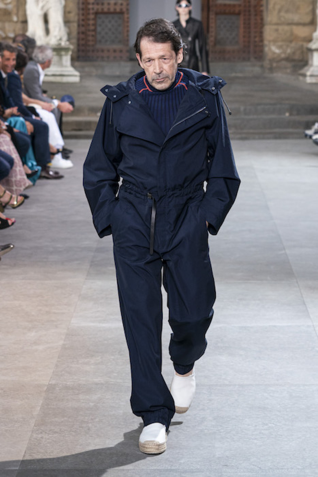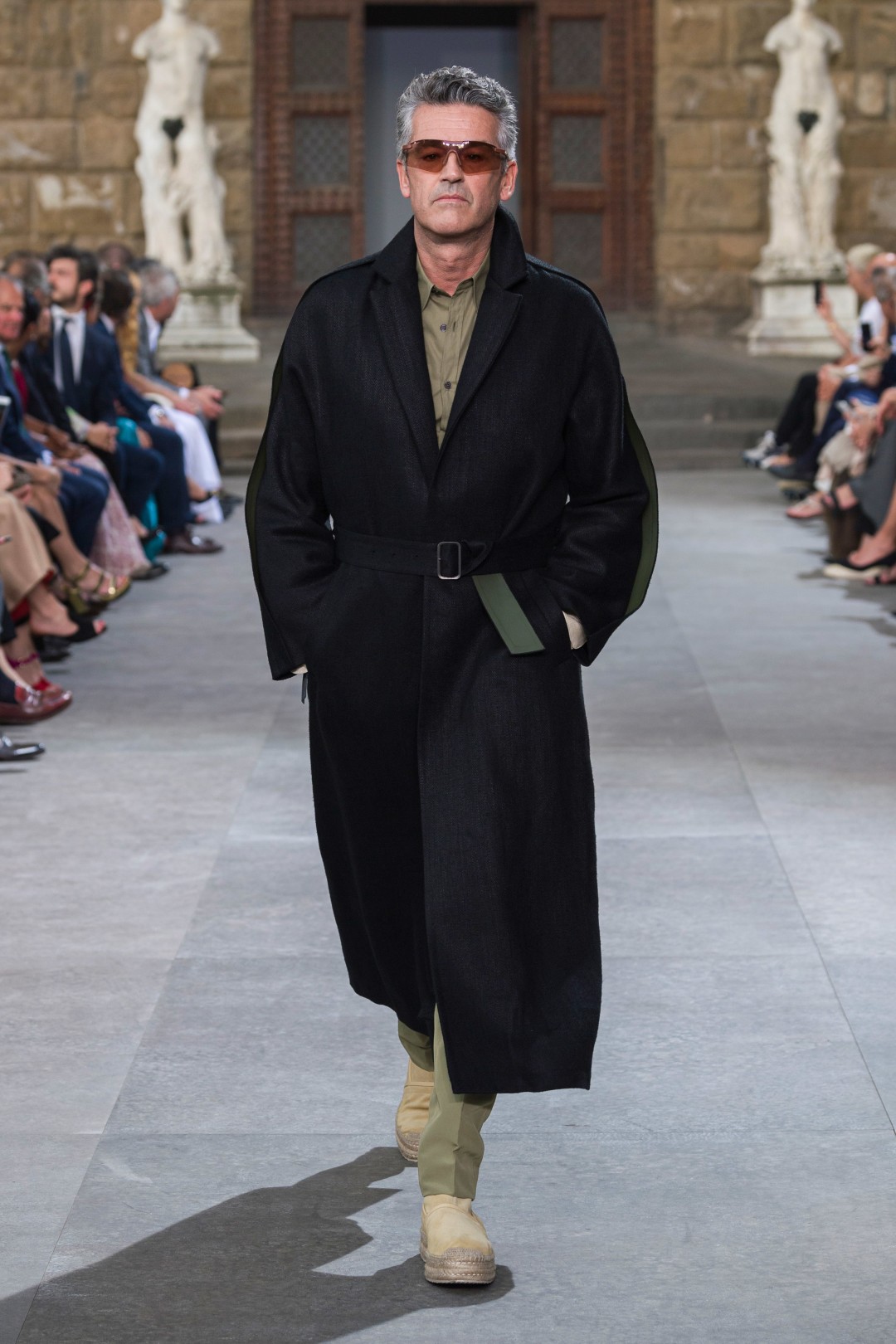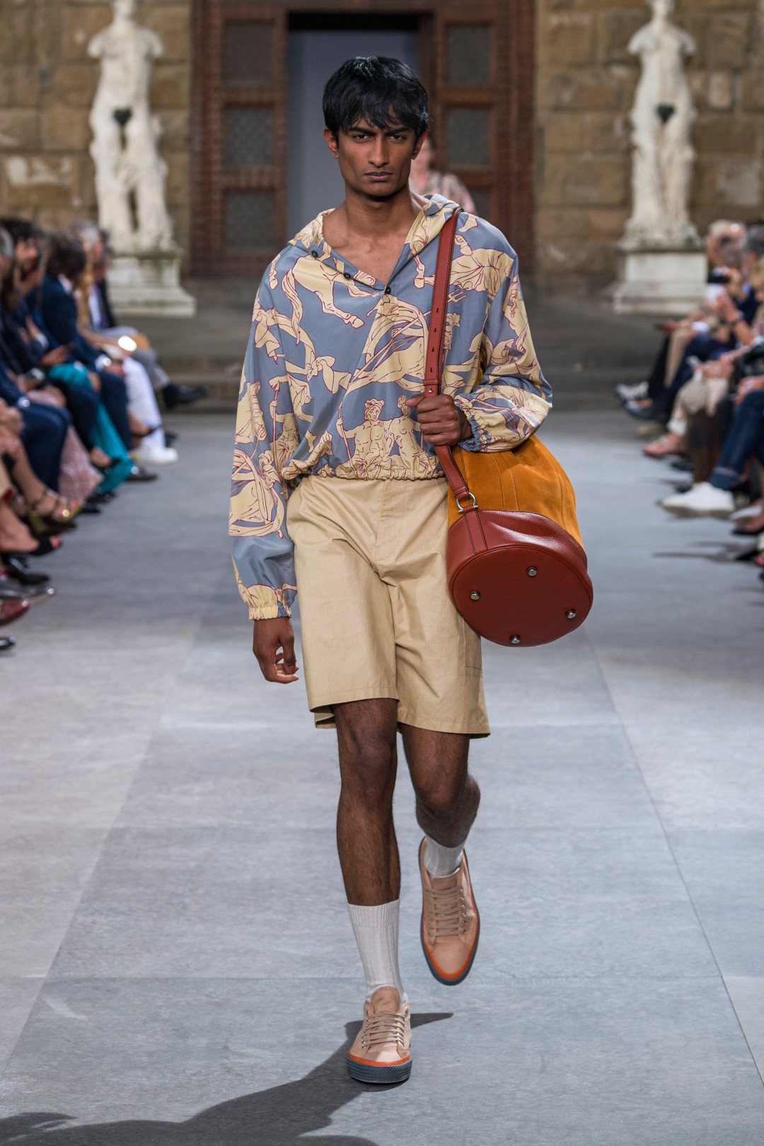 Еще один дебют в мужской моде — на этот раз креативного директора Salvatore Ferragamo Пола Эндрю, который в феврале получил руководство над всеми линиями бренда, — состоялся на флорентийской площади Синьории. Сет-дизайном шоу служили главные городские маст-визит — Палаццо Векккьо, скульптура Давида и фонтан Нептуна, открытый после реставрации, деньги на которую пожертвовали Salvatore Ferragamo. Неудивительно, что изображения фонтана стали принтами на шелковых рубашках и платьях свободного кроя, стилизованных замшевыми рюкзаками и эспадрильями на высокой платформе и чередовавшихся с кожаными жилетами, оранжевыми ветровками и комбинезонами «boiler suits». В последнем, кстати, на подиум вышел графический дизайнер Питер Сэвилл, который создал (помимо обложек Joy Division) логотип Calvin Klein и новую монограмму Burberry.