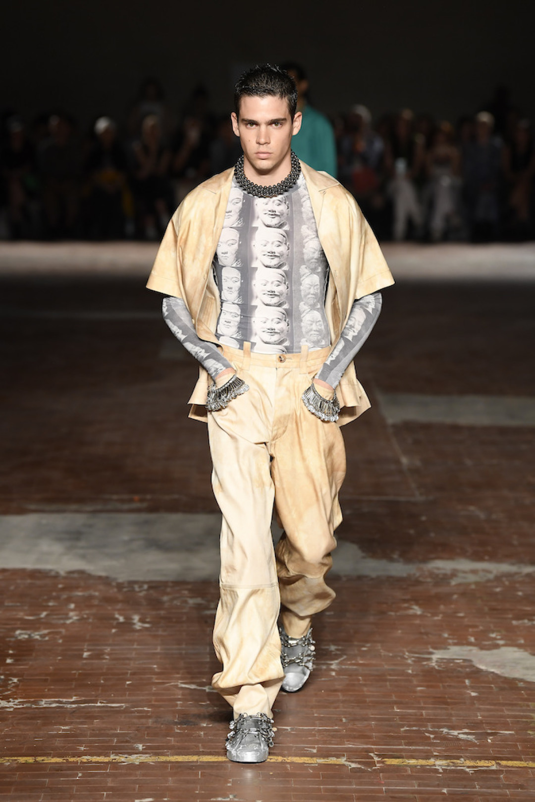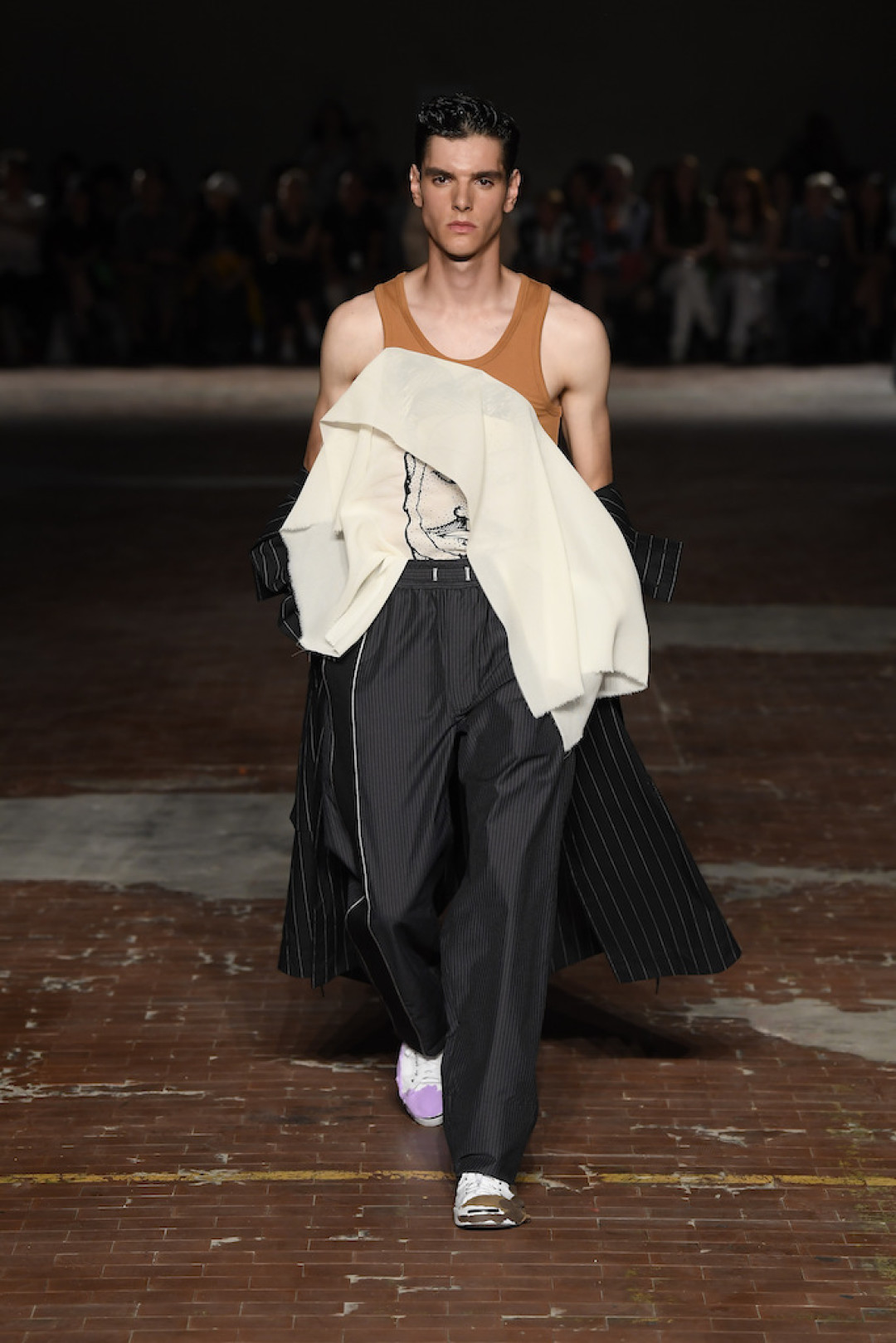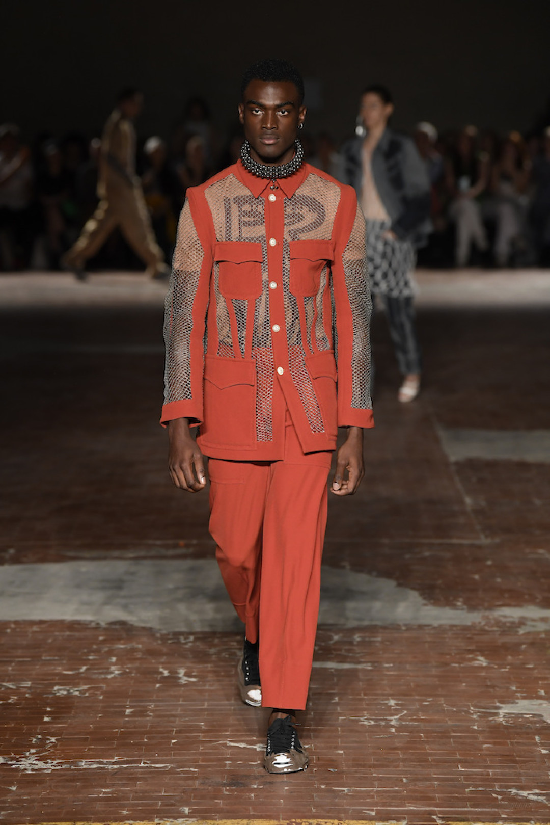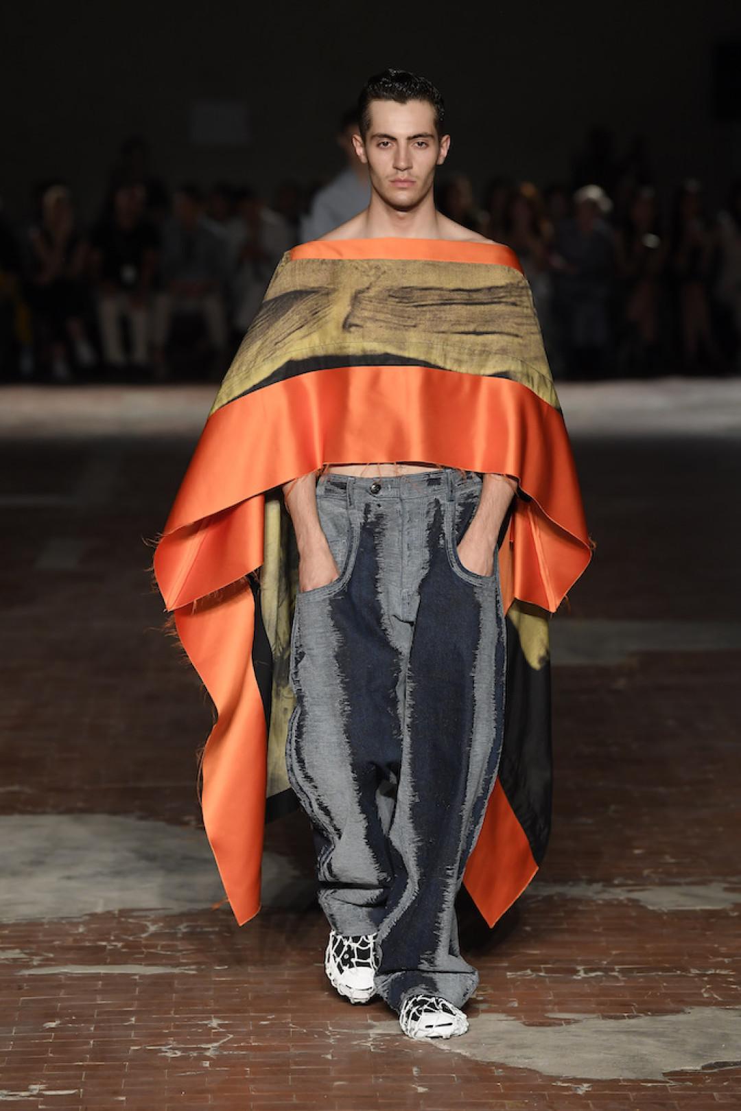 Еще один дебют в мужской моде — на этот раз креативного директора Salvatore Ferragamo Пола Эндрю, который в феврале получил руководство над всеми линиями бренда, — состоялся на флорентийской площади Синьории. Сет-дизайном шоу служили главные городские маст-визит — Палаццо Векккьо, скульптура Давида и фонтан Нептуна, открытый после реставрации, деньги на которую пожертвовали Salvatore Ferragamo. Неудивительно, что изображения фонтана стали принтами на шелковых рубашках и платьях свободного кроя, стилизованных замшевыми рюкзаками и эспадрильями на высокой платформе и чередовавшихся с кожаными жилетами, оранжевыми ветровками и комбинезонами «boiler suits». В последнем, кстати, на подиум вышел графический дизайнер Питер Сэвилл, который создал (помимо обложек Joy Division) логотип Calvin Klein и новую монограмму Burberry.